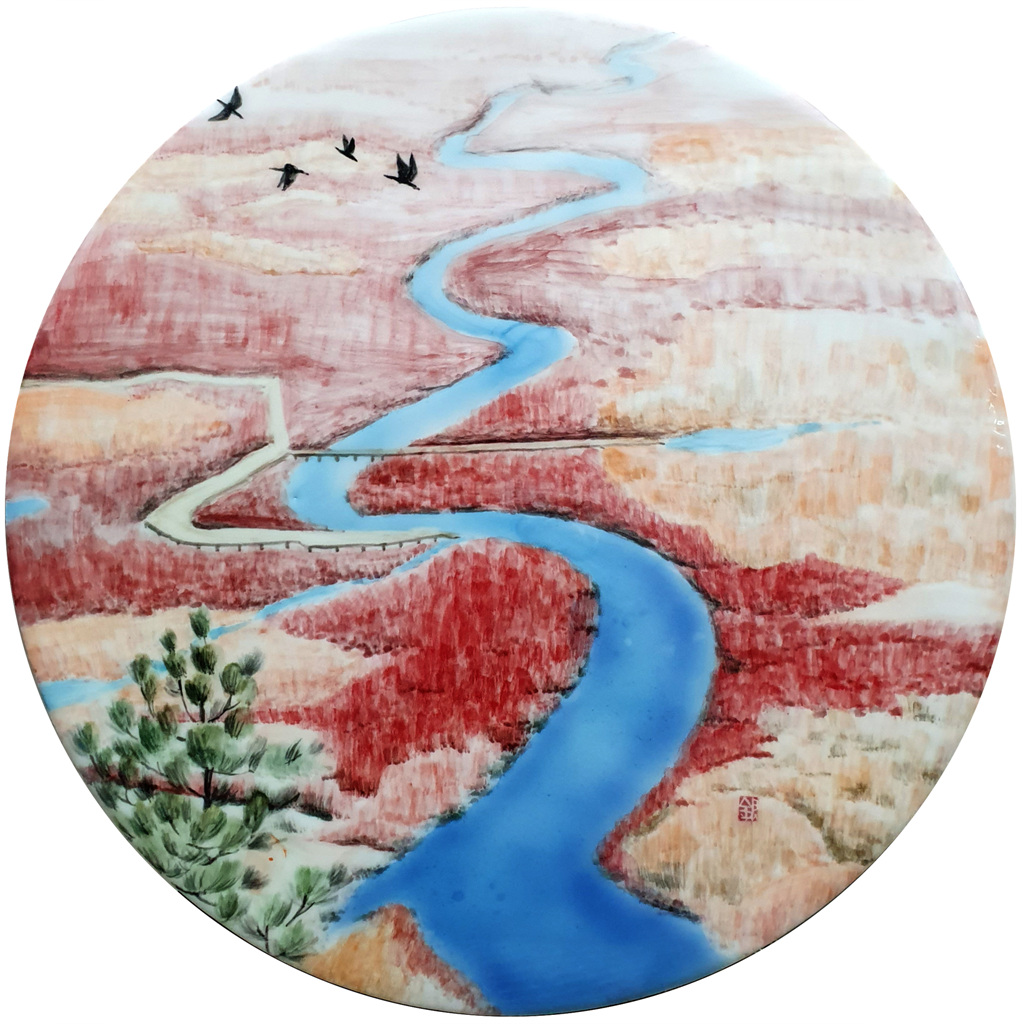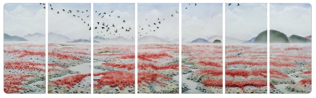 갯벌에서 자생하는 칠면초 군락 그림은 회색빛 바탕에 울긋불긋 이색적인 자연의 풍광을 그대로 도판에 옮겨 아름다움을 부각시켰다. 전시작품들은 도판위에 안료를 뿌리거나 바르고 다시 유약 작업을 한 뒤 1230도 가마에 산화 소성하여 제작 되었다.