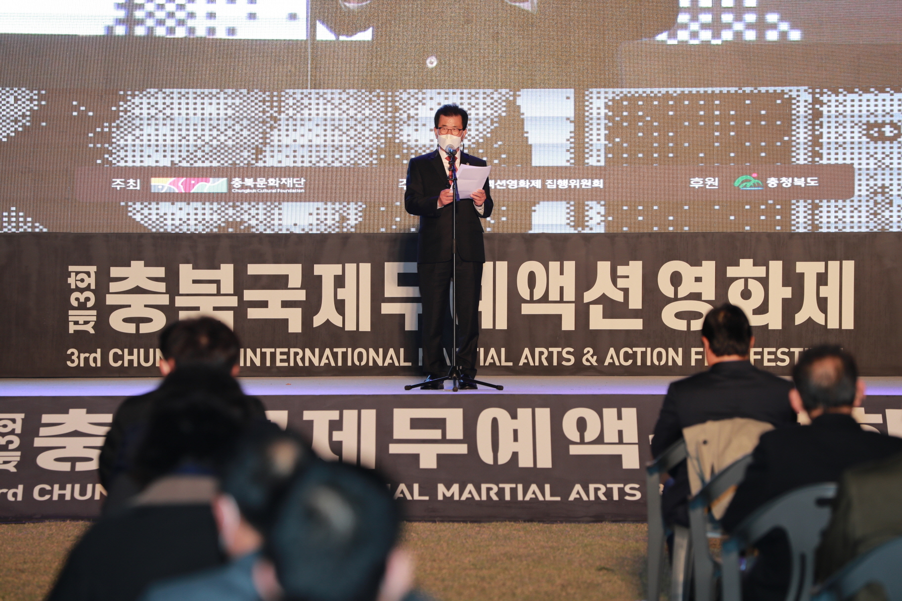 개막식은 이시종 도지사를 비롯해 박문희 도의장, 김경식 영화제 집행위원장, 부집행위원장인 배우 이범수 씨 등 영화제 관계자를 비롯해 할리우드에 처음 진출한 한국 감독인 박우상 감독(대표작 ‘차이나타운’), 한국형 누아르를 만든 장현수 감독(대표작 ‘게임의 법칙’) 등 무예 액션 영화에 굵직한 공로를 세운 영화 제작자, 무술 감독, 배우 등이 참석해 자리를 빛냈다.