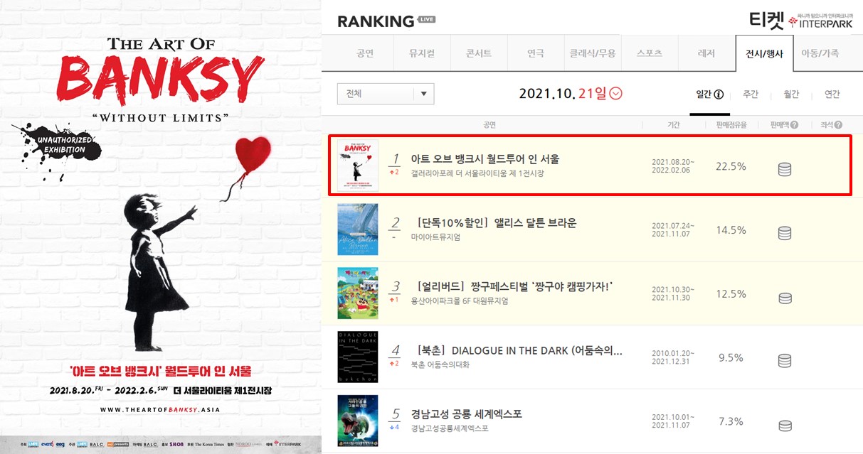 '아트 오브뱅크시(The Art of Banksy - Without Limits)'가 전시 오픈 두 달이 지난 현 시점에도 21일 오전 인터파크 티켓 사이트에서 전시/행사 예매율 1위를 기록을 이어가는 등 관람객들 사이에서 핫한 전시로 그 명성을 이어가는 가고 있다.