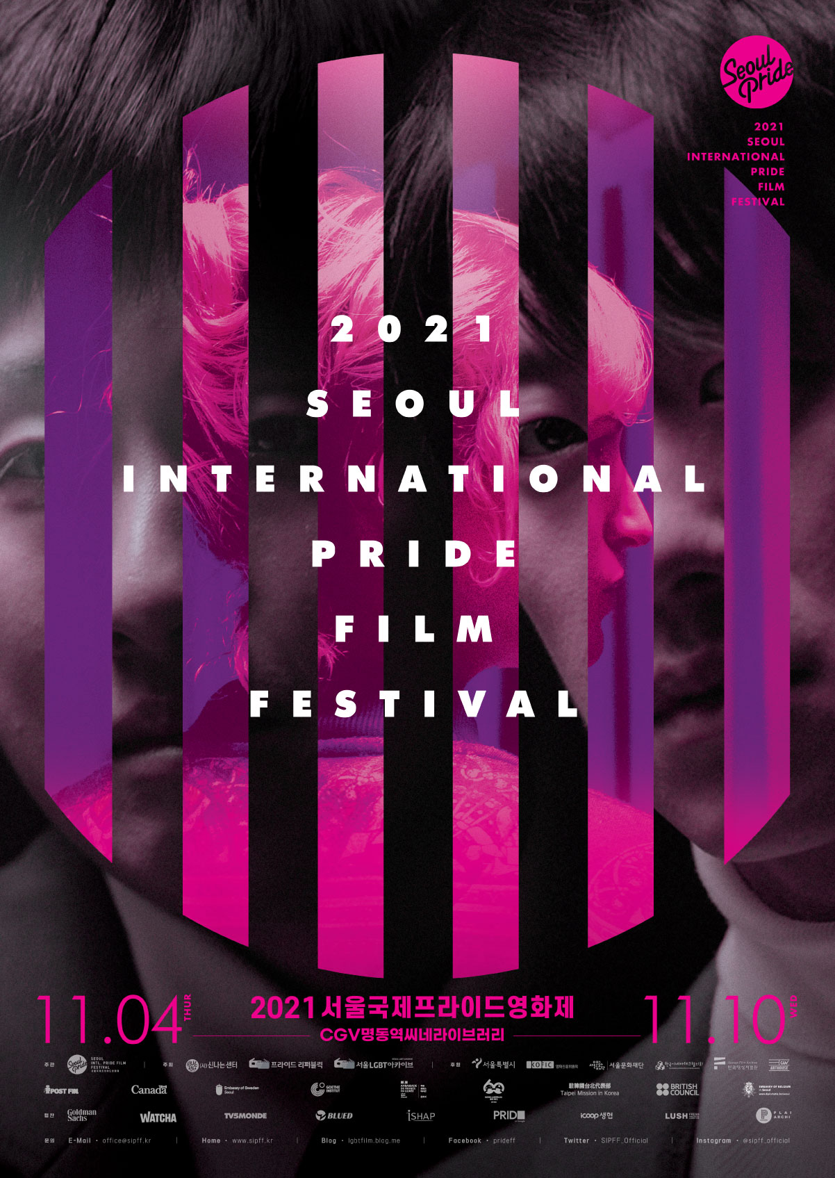| 행사명 2021 서울국제프라이드영화제 (2021 Seoul International PRIDE Film Festival aka. SIPFF2021) 기간 2021년 11월 04일(목) – 11월 10일(수) 7일간 장소 CGV명동역 씨네라이브러리 주최 프라이드 리퍼블릭, 서울LGBT아카이브, (사)신나는센터 주관 서울국제프라이드영화제 집행위원회 후원서울특별시, 영화진흥위원회, 서울문화재단, 한국시네마테크협의회, 한국영상자료원, CGV아트하우스, 포스트핀, 주한캐나다대사관, 주한스웨덴대사관, 주한독일문화원,주한프랑스문화원,주한호주대사관주한대만대표부,영국문화원,주한벨기에대사관 협찬 골드만삭스, 왓챠,TV5MONDE, 블루드,아이샵,구글코리아,아이쿱생협, LUSH, 플레인아카이브 집행위원장 김조광수(영화사 청년필름 대표) 집행위원 김태용(영화감독), 백은하(백은하 배우연구소 소장), 이영진(배우/모델), 임보라(섬돌향린교회목사), 심상정(국회의원), 하리수(가수/배우), 홍석천(배우/방송인), 심우찬(패션칼럼리스트) 자문위원 김영덕(부천국제판타스틱영화제 프로그래머), 김영우(DMZ 국제다큐영화제 프로그래머), 희망법(공익인권변호사모임 희망을 만드는 법) 공식사이트 http://sipff.kr/ https://www.facebook.com/prideff https://twitter.com/SIPFF_Official https://www.instagram.com/sipff_official/ https://blog.naver.com/lgbtfilm http://lgbtfilm.blog.me/ |