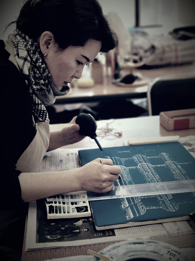 작품 소재를 사진으로 찍기도 하고 종이에 연필 스케치하여 작품 준비를 한다. 본격적인 작업으로 물감을 바른 도판에 뾰족한 도구로 긁어 형체를 표현한다.