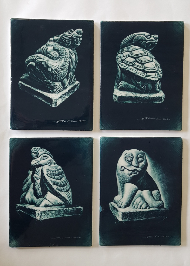 가는 선들을 겹겹이 그어서 원하는 형태와 질감을 표현하는데 수 백, 수 만 번의 선들이 겹쳐져야 원하는 완성도의 작품을 얻을 수 있다. 완성된 그림은 유약을 입혀 고온 가마에 구워야 완성되는 과정들을 거친다.