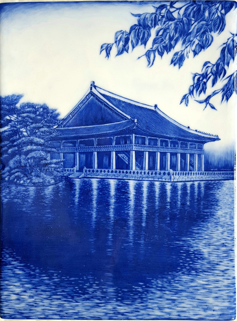 "경회루 측면" 작품은 한국 사람들뿐만 아니라 한국을 좋아하는 사람들이라면 다 알 수 있는 유명한 건물로 잔잔한 호수와 함께 완성도 높은 구도를 보여주는 측면의 경회루를 한 폭의 풍경화처럼 단아한 모습으로 도판에 옮겼다.