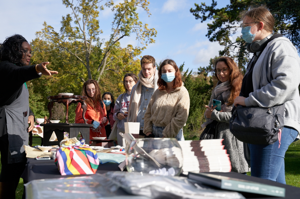 (사진) 국제 학생 기숙사촌 캠페인 부스를 찾은 유학생들(좌측),