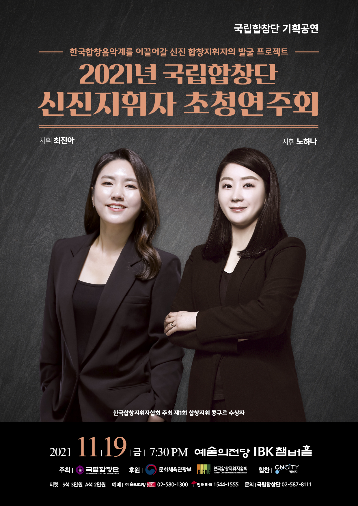 이번 '신진지휘자 초청연주회'는 2021년 9월, 한국합창지휘자협회(이사장 김억숙)가 주최한 제1회 합창지휘 콩쿠르에서 수상한 최진아, 노하나가 객원 지휘자로서 국립합창단과 함께 선보이는 데뷔 무대다.