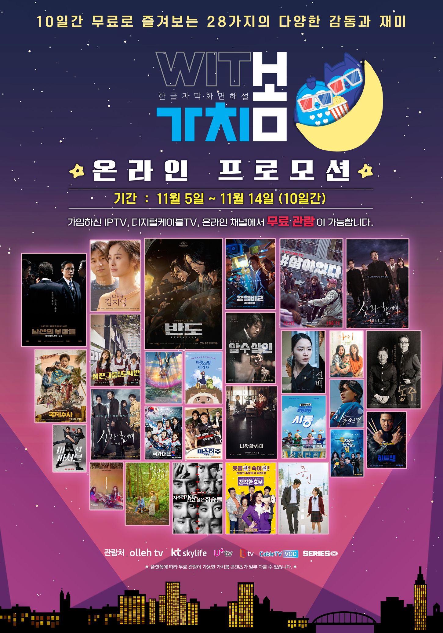 올해로 2회째를 맞이한 가치봄 온라인 프로모션은 오는 11월 5일(금) ~ 11월 14일(일) 총 10일동안 28편의 다양한 가치봄 영화를 무료로 관람할 수 있다.