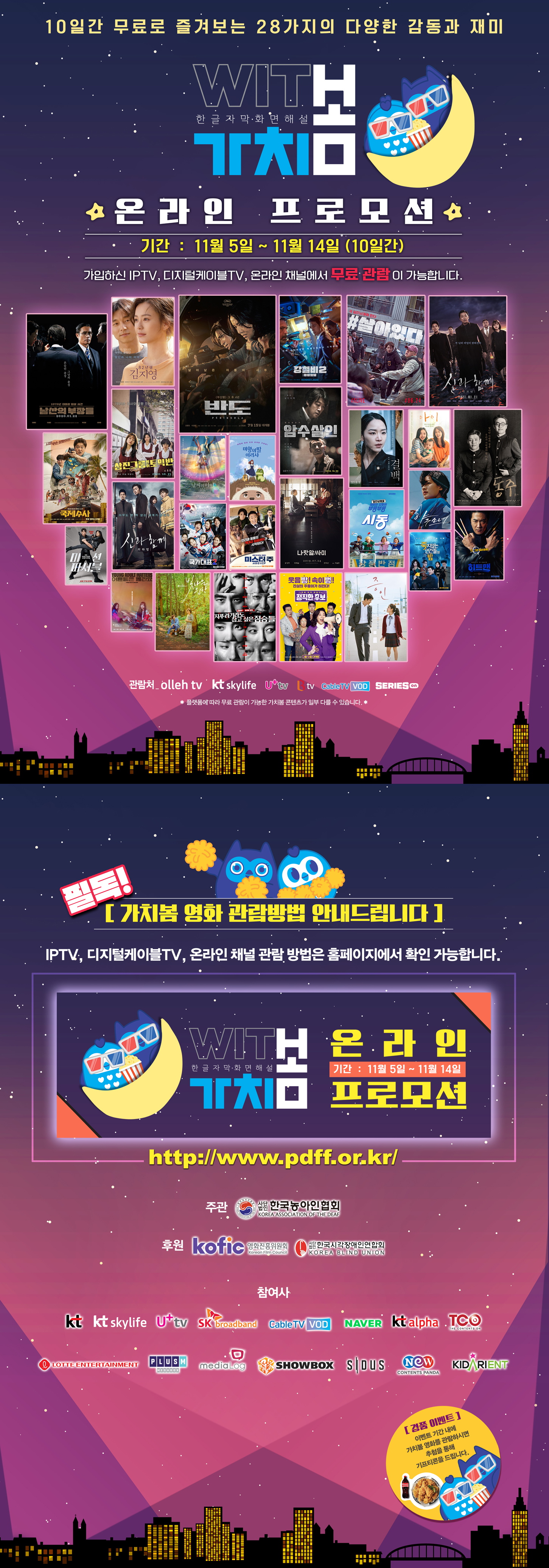 | 명칭: 21년 가치봄 온라인 프로모션 일시 2021년 11월 5일(금) ~ 11월 14일(일) 상영 플랫폼: KT 올레TV, KT Skylife, LG 유플러스TV, SK Btv ,케이블 TV VOD, 네이버 시리즈온 주최: 한국농아인협회 |