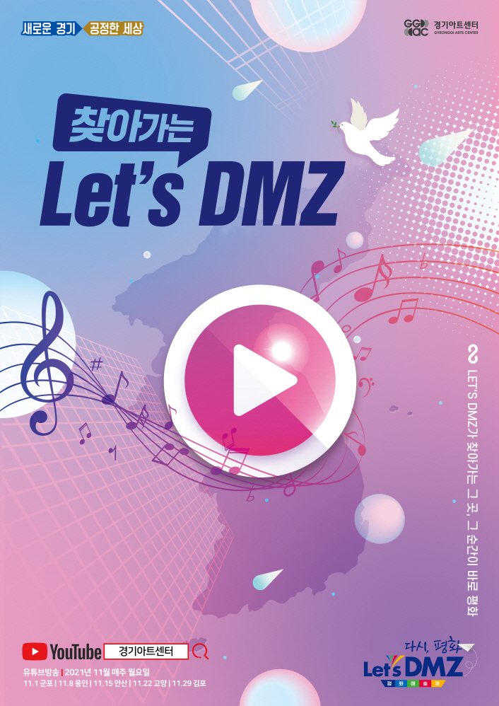 '2021 찾아가는 Let's DMZ' 경기도 주요 시·군에서 진행 및 녹화,강연과 음악 어우러진 콘서트 통해 한반도 평화·DMZ 가치 공감대 형성11월 매주 월요일, 경기아트센터 유튜브 채널에서 현장 영상 ..
