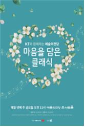 | 올해 새롭게 론칭한 'KT와 함께하는 예술의전당 마음을 담은 클래식'에서는 국내에서 활발히 활동 중인 중견 연주자를 중심으로 지휘자 이택주가 이끄는 KT심포니오케스트라가 깊이 있고 풍성한 연주를 선보인다. 또한, 2004년 마티네 콘서트를 론칭해 전국에 마티네 콘서트 열풍을 일으킨 피아니스트 김용배가 콘서트 가이드로 나서 쉽고 재미있는 해설을 곁들여 초심자와 애호가 모두 만족하는 음악회다. |