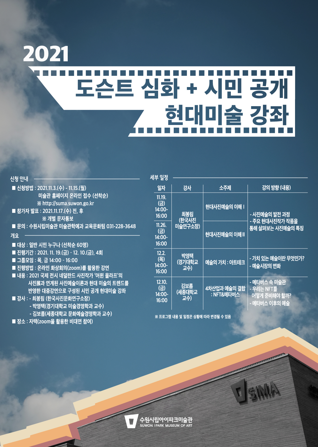 이번 강좌는 수원시립미술관 도슨트 대상 심화 교육 과정이나 현대미술과 사진에 관심 있는 일반 시민에게도 개방된다. 11월 3일(수)부터 수원시립미술관 누리집(http://suma.suwon.go.kr)에서 선착순 60명까지 신청 가능하다.