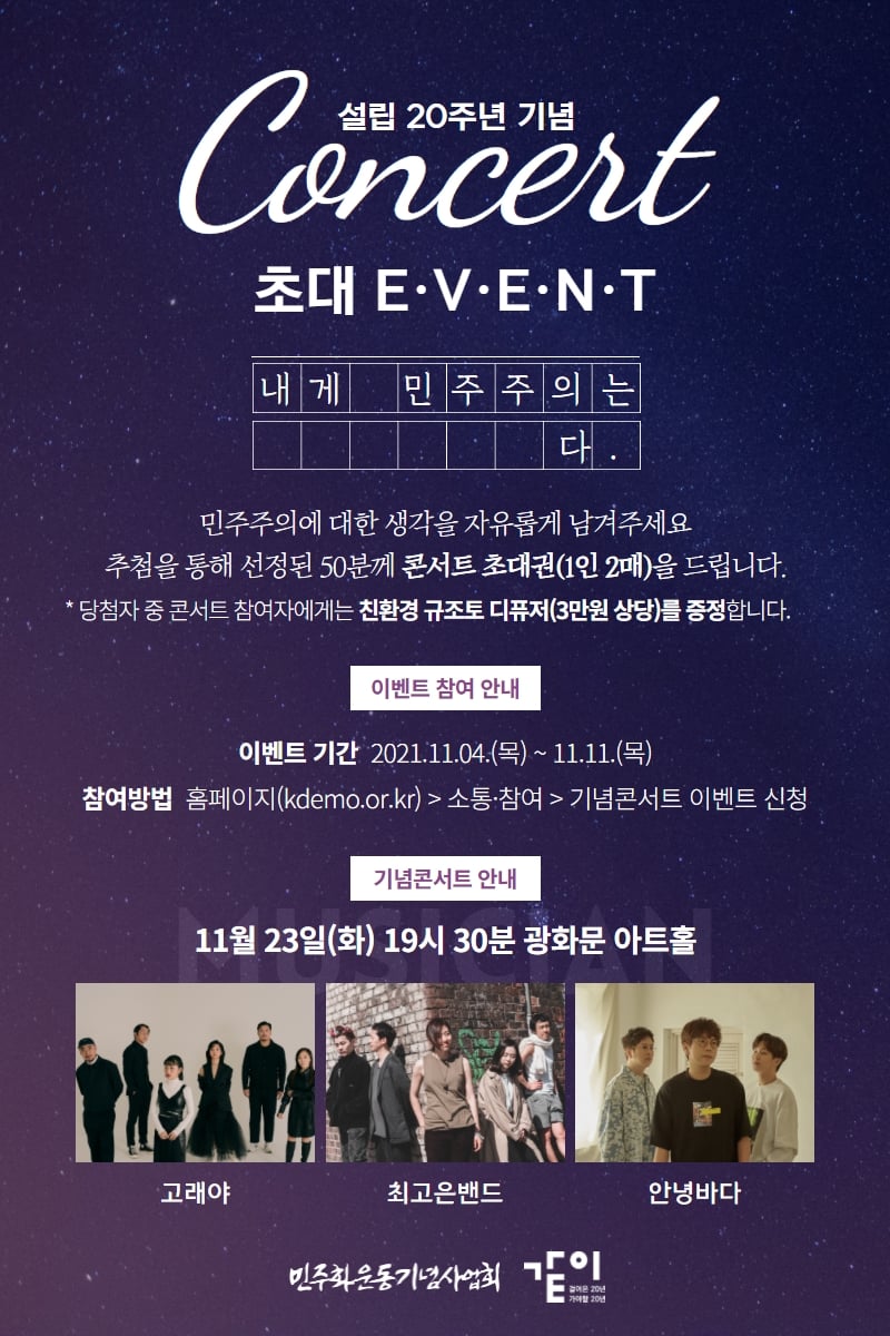 사업회 홈페이지로 ‘나에게 민주주의는 000다’ 문장을 입력해 신청하면 50명을 추첨해 1인 2매의 콘서트 초대권을 보낼 예정이다.