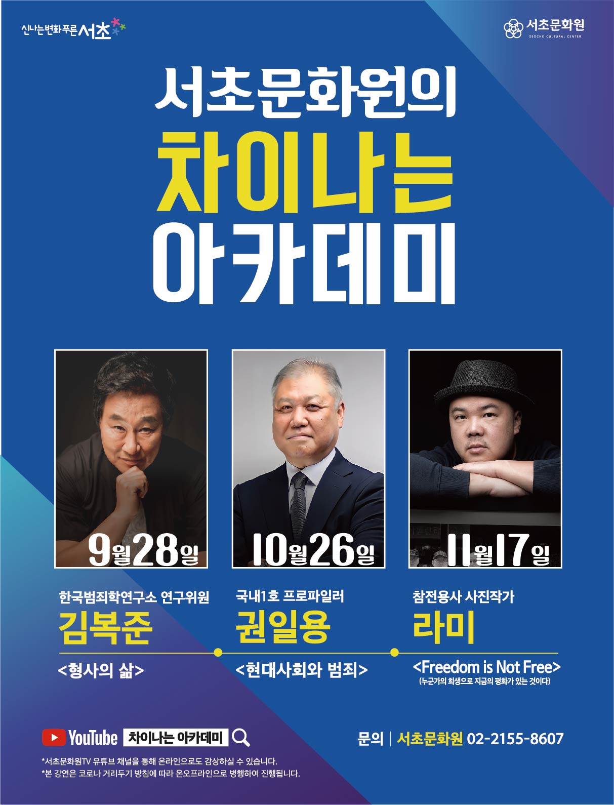 한편, '서초문화원의 차이나는 아카데미'는 예술, 경제, 역사 등 다양한 분야의 전문가들을 초빙해 수준 높은 인문학 강좌를 선보이는 프로그램으로 코로나로 중단됐던 대면 강의를 방역지침 준수 하에 오는 소수 인원을 대상으로 재개한다.