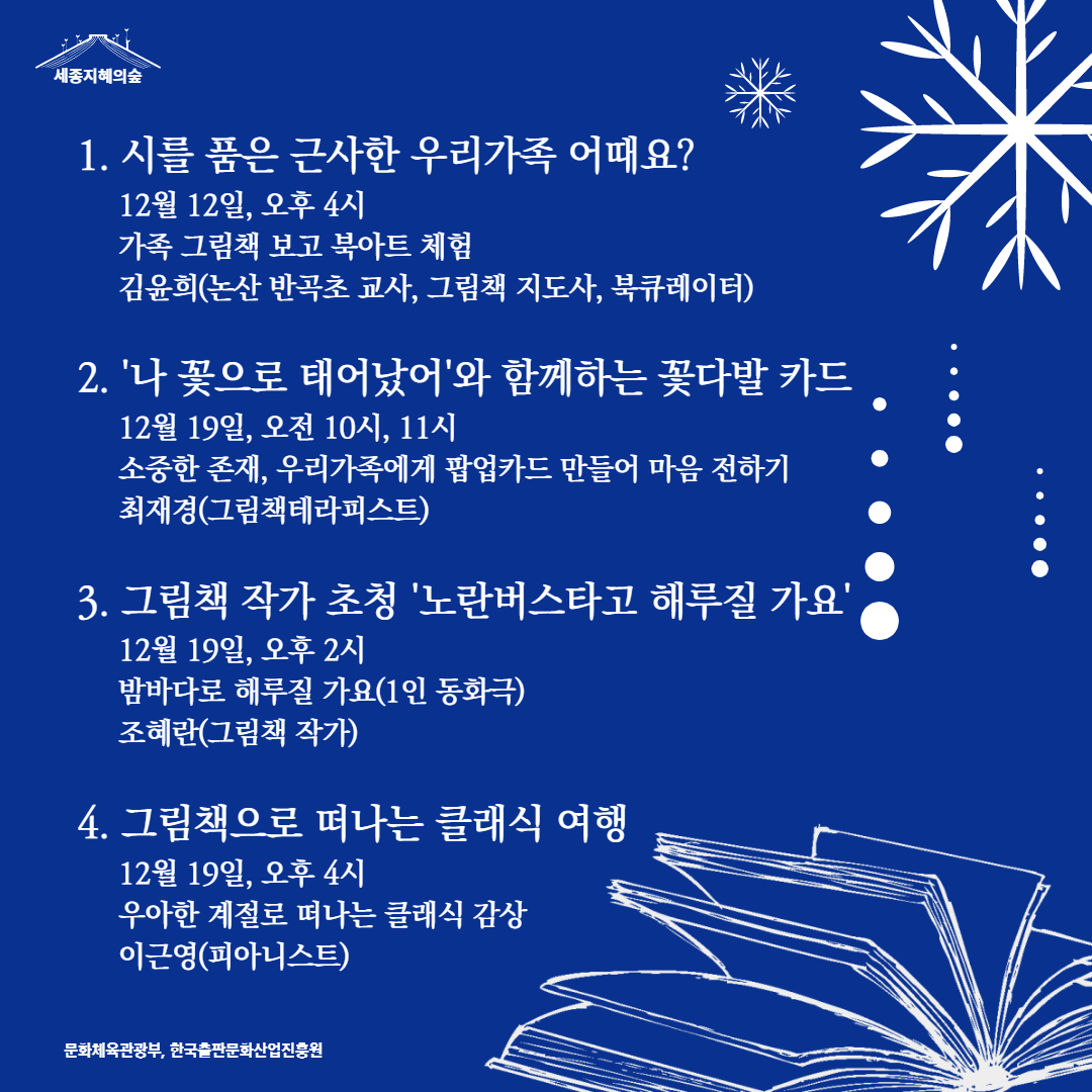 ‘우리 동네 사색하는 지혜의숲’을 테마로 진행되는 올해의 마지막, 12월 인문강좌에서는 ‘환상적인 동화 속으로 가족이 함께 떠나는 여행’을 주제로 조혜란 그림책 작가, 김윤희 그림책 지도사, 최재경 그림책테라피스트, 이근영 피아니스트가 함께 한다.