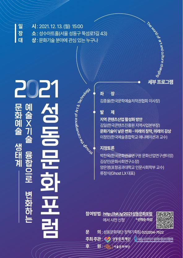포럼은 문화기술에 관심 있는 사람이라면 누구나 참가할 수 있다. 참가 신청은 오는 12월 12일까지 사전 신청 페이지(bit.ly/2021성동문화포럼)에서 하면 된다.