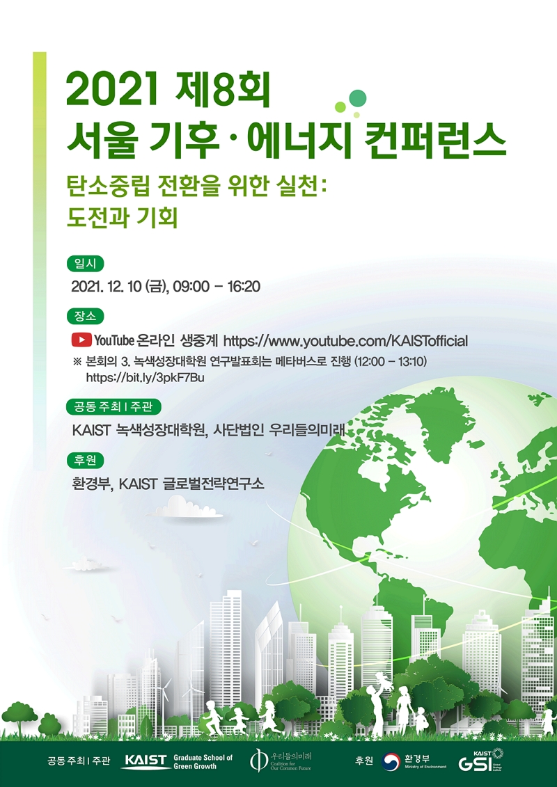 [플레이뉴스 문성식기자] KAIST 경영대학은 2021 제8회 서울 기후·에너지 컨퍼런스를 오는 12월 10일(금) 개최한다. 이번 컨퍼런스는 KAIST 녹색성장대학원(원장 엄지용)과 (사)우리들의미래(이사장 여훈구)가 공동으로 주최 및 주관하고 환경부와 KAIST 글로벌전략연구소가 후원한다.