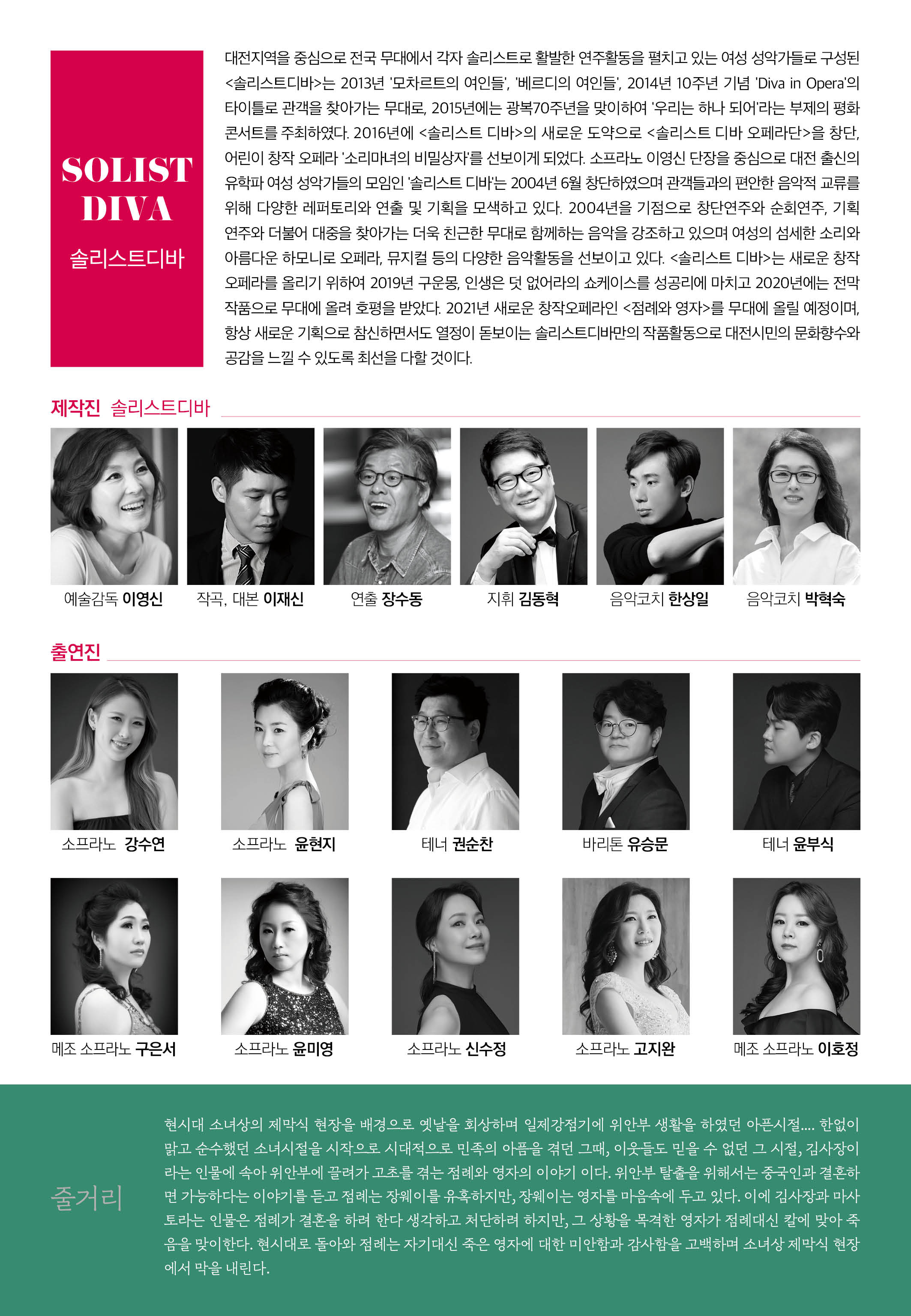 2016년에 <솔리스트 디바>의 새로운 도약으로 <솔리스트 디바 오페라단>을 창단, 어린이 창작 오페라 '소리마녀의 비밀상자'를 선보이게 되었다. 소프라노 이영신 단장을 중심으로 대전 출신의 유학파 여성 성악가들의 모임인 '솔리스트 디바'는 2004년 6월 창단하였으며 관객들과의 편안한 음악적 교류를 위해 다양한 레퍼토리와 연출 및 기획을 모색하고 있다. 2004년을 기점으로 창단연주와 순회연주, 기획연주와 더불어 대중을 찾아가는 더욱 친근한 무대로 함께하는 음악을 강조하고 있으며 여성의 섬세한 소리와 아름다운 하모니로 오페라, 뮤지컬 등의 다양한 음악활동을 선보이고 있다. <솔리스트 디바>는 새로운 창작 오페라를 올리기 위하여 2019년 구운몽, 인생은 덧 없어라의 쇼케이스를 성공리에 마치고 2020년에는 전막작품으로 무대에 올려 호평을 받았다.