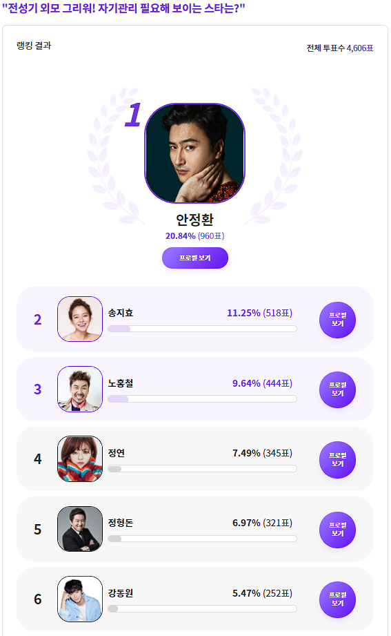 커뮤니티 포털사이트 디시인사이드(대표 김유식)와 취향 검색 기업 마이셀럽스가 운영 중인 `익사이팅디시`가 `전성기 외모 그리워! 자기관리 필요해 보이는 스타는?`으로 투표를 한 결과 안정환이 1위에 올랐다.