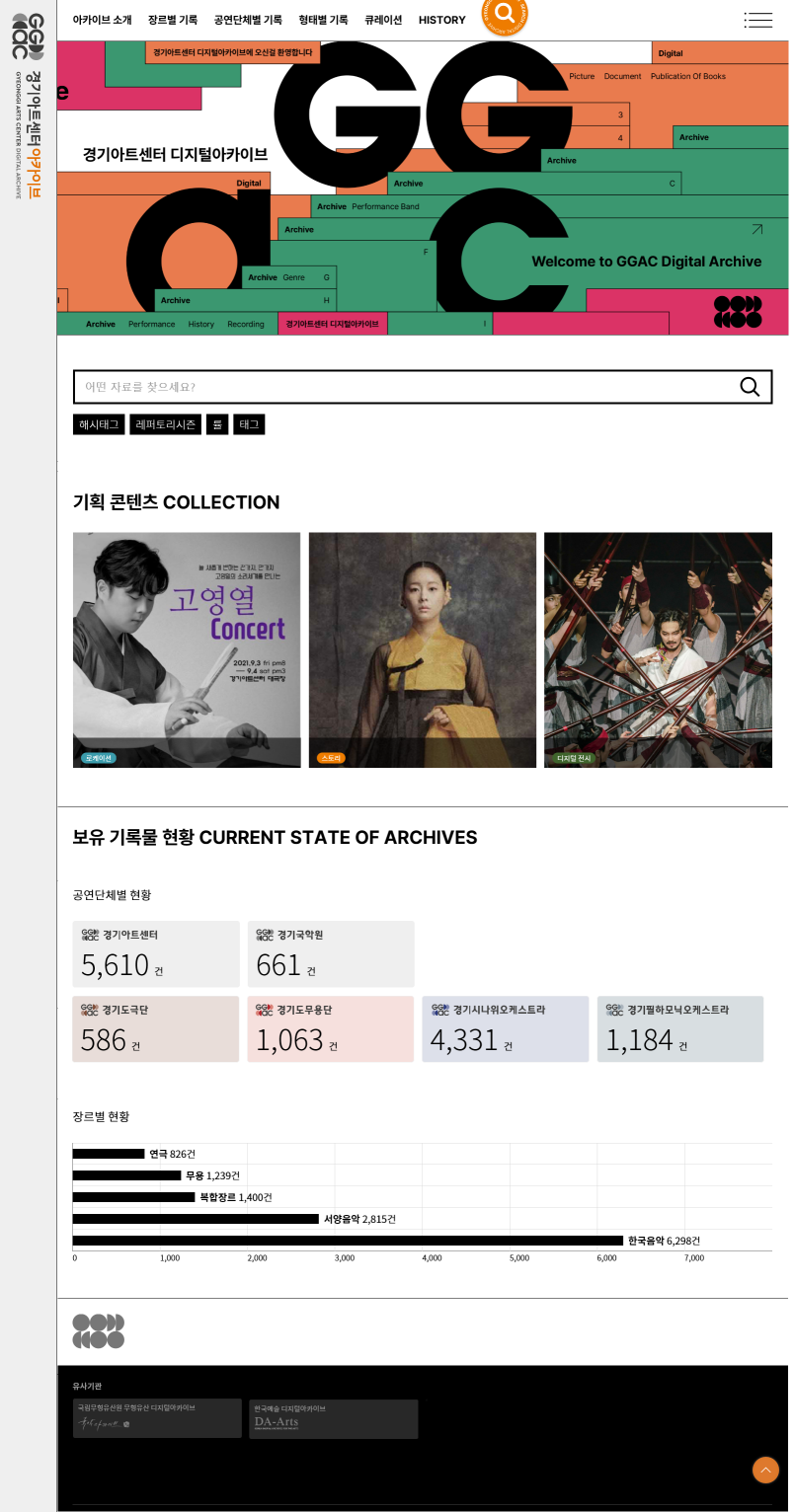 경기아트센터 아카이브는 아트센터와 소속단체인 경기도예술단의 역대 공연예술자료를 장르별, 단체별, 형태별로 수집·분류하여 제공한다.