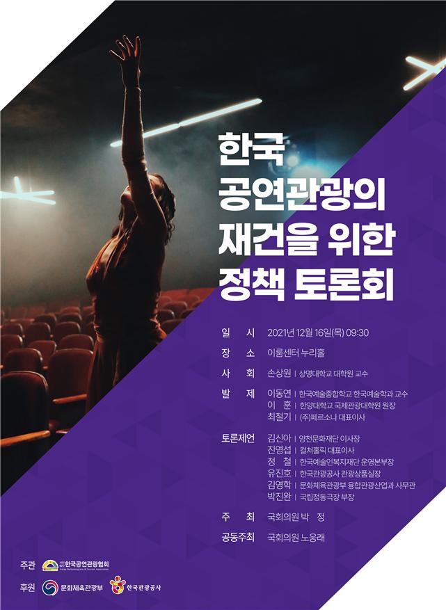 더불어민주당 박정 의원(파주 을)이 주최하고, 노웅래 의원(마포 갑)이 공동주최한 이번 정책토론회에서는, 급격히 침체된 한국 공연관광시장의 현 상황을 점검하고, 이를 타개하기 위한 방안을 모색하는 자리다.