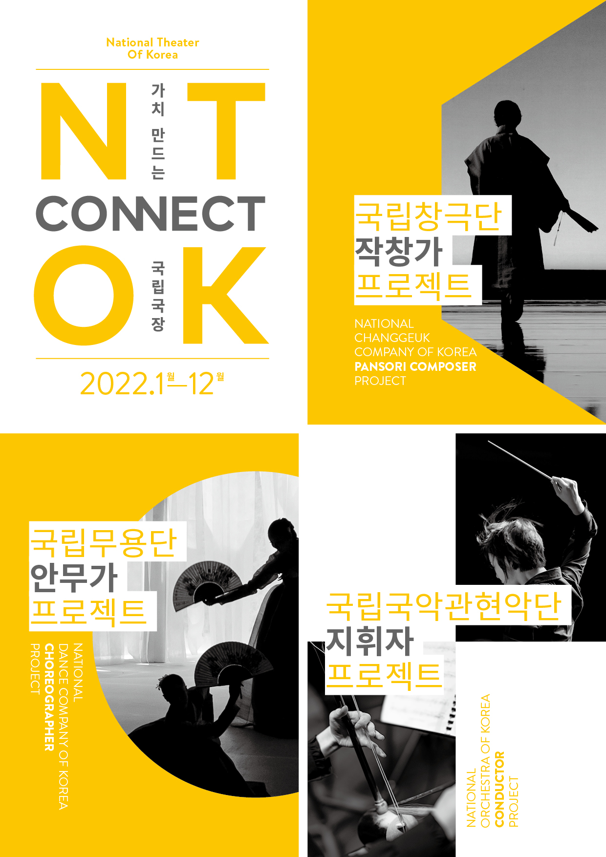 가치 만드는 국립극장2022년 말까지 진행되는 중장기 사업이다. 이달 16부터 국립창극단 작창가 프로젝트와 국립국악관현악단 지휘자 프로젝트모집이 시작되며, 내년 2월 국립무용단 안무가 프로젝트모집이 이어진다.