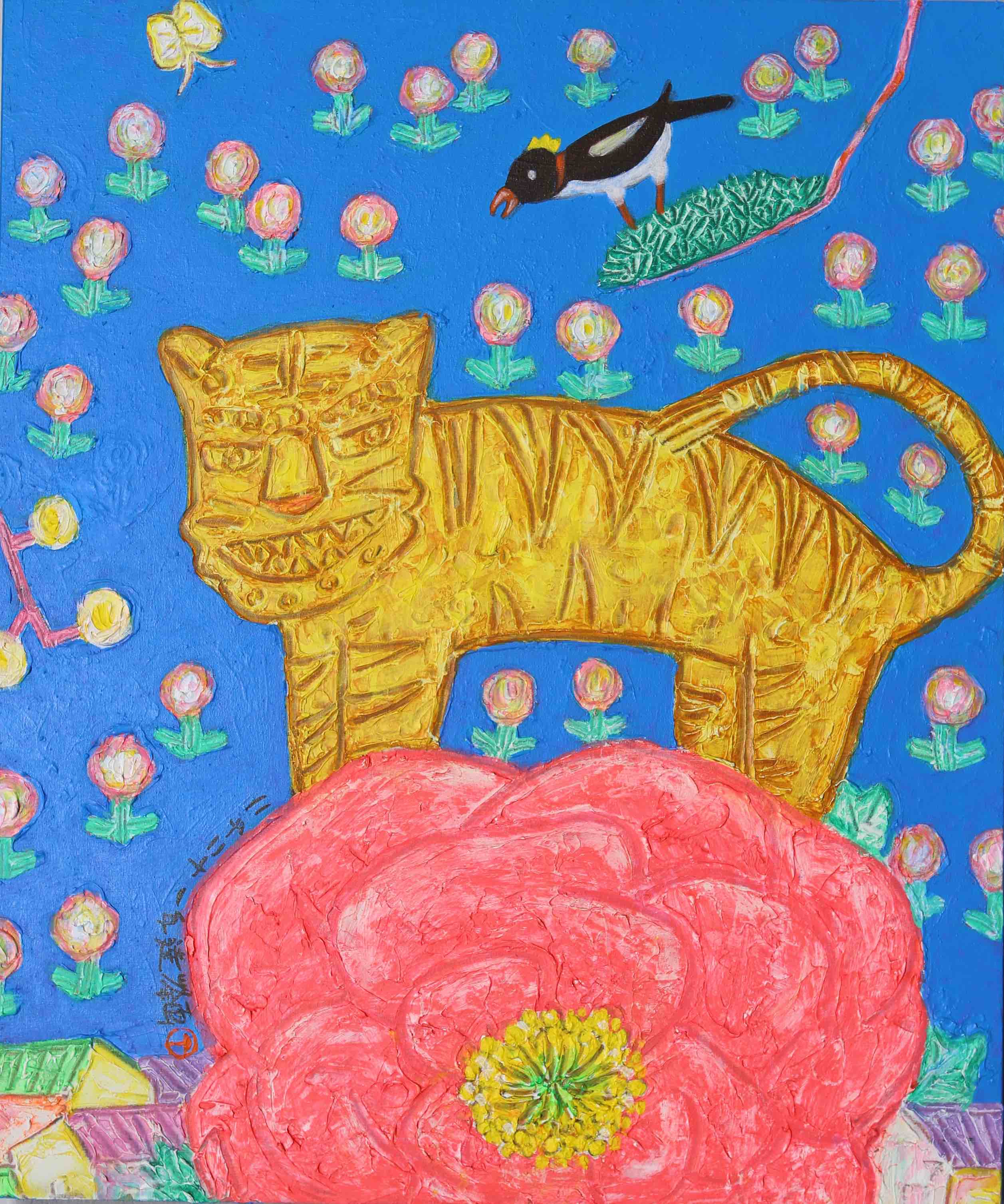 민화의 소재만 빌려왔을 뿐 비현실적이고 초현실적인 공간개념을 탑재하는 까닭이다. 호랑이와 까치, 모란, 나비 그리고 가옥과 아이들이 어우러지는 구성은 조형공간을 뛰어넘는 문학적인 서정미를 발설한다.