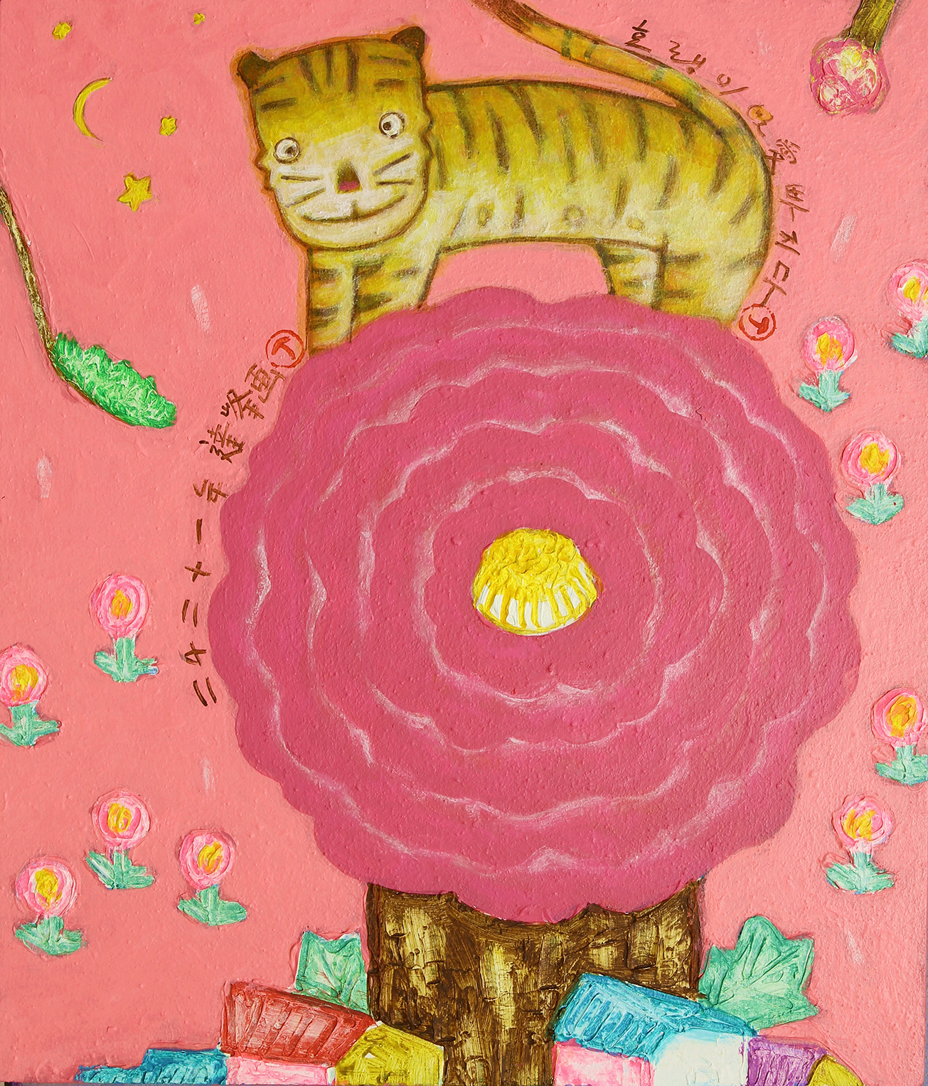 이번 전시는 어려운 시국에 태평성대를 누리길 바라는 마음으로 꽃에 빠진 행복한 호랭이 작품을 선보인다 그가 묘사하는 호랑이는 포효하는 용맹스러운 모습이 아니라 상징적이고 친근감있는 이미지를 담고 있다.