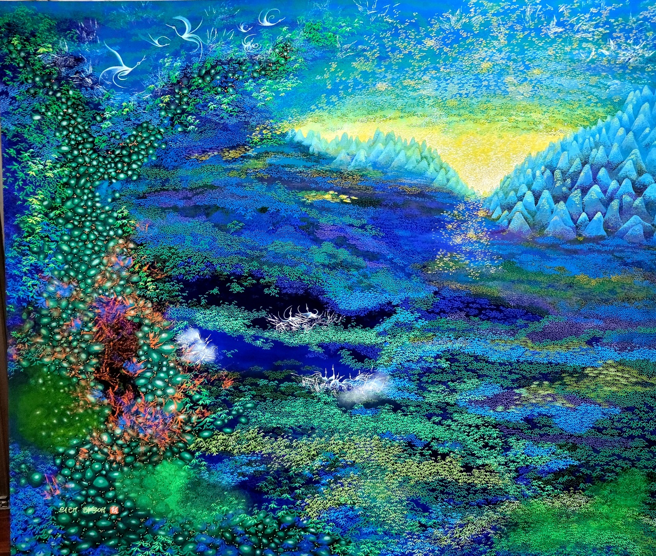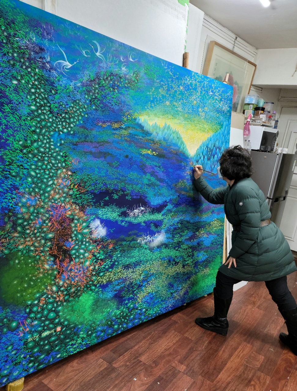[플레이뉴스 문성식기자] 붓으로 작은 점을 찍으며 화려하고 몽환적인 산세와 숲의 이미지를 만든다.