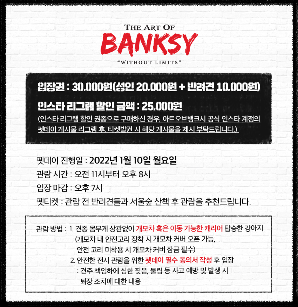 오는 1월 10일부터 단 하루간 진행될 '아트 오브뱅크시'펫데이는 반려견과 반려인, 그리고 비반려인이 함께 소통하며 문화생활을 즐길 수 있도록 기획된 이벤트로, 견종 몸무게와 상관 없이 반려견 전용 유모차 혹은 이동 가능한 이동장에 탑승한 반려견이라면 반려인과 함께 입장하여 전시를 즐길 수 있다.