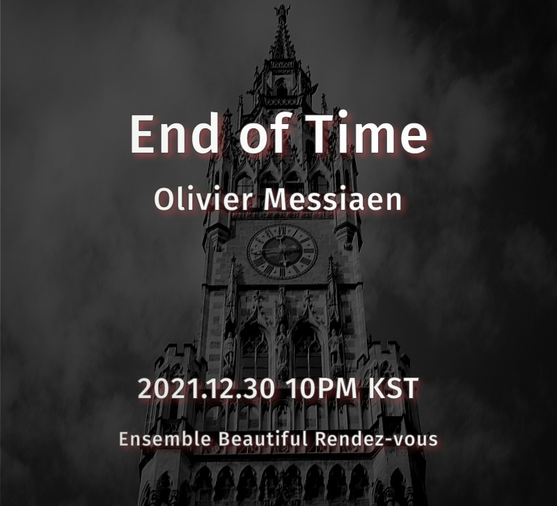 [플레이뉴스 문성식기자] 한국 클래식 주역들이 모인 앙상블 뷰티풀 랑데부(예술감독 김가람)가 제작한 프랑스 현대 음악 거장 올리비에 메시앙(Olivier Messiaen)의 실내악 대작 ‘시간의 종말(End of Time)’ 뮤직비디오가 한국 시각으로 12월 30일 밤 10시 앙상블 뷰티풀 랑데부 유튜브 채널을 통해 공개된다.