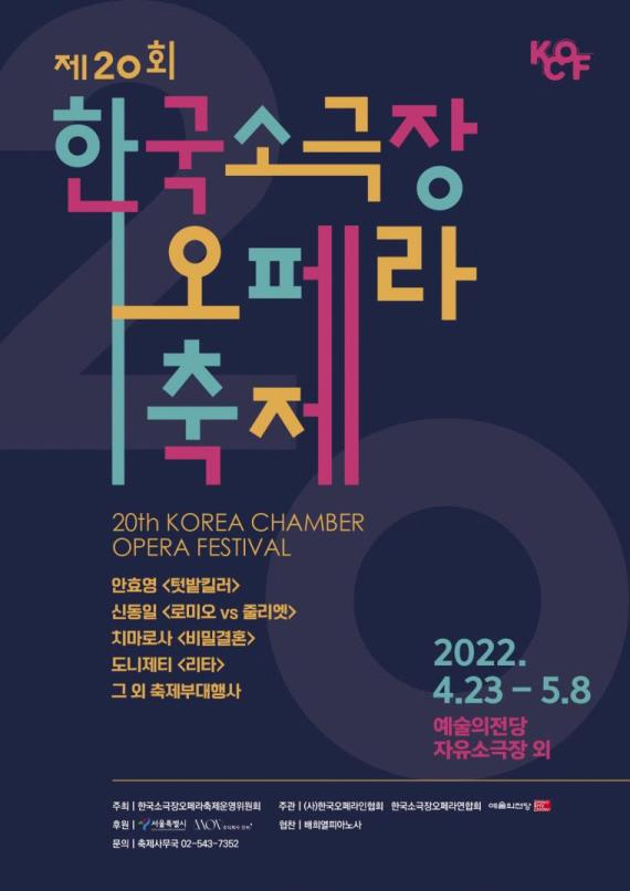 한편, 제20회 한국소극장오페라축제는 4월 23(토)부터 5월 8일(일)까지 예술의전당에서 펼쳐진다. 창작오페라로는 안효영 작곡 <텃밭킬러>(4.23~), 신동일 작곡 <로미오 vs 줄리엣>(4.24~), 번안오페라로는 도니제티(G. Donizetti) 작곡 <리타>(4.27~), 치마로사(D. Cimarosa) 작곡 <비밀결혼>(4.26~)까지 네 편 모두 5회 공연의 우리말로 공연된다. 평균 85분의 공연시간으로 지루할 틈 없는 재미와 감동을 선사할 예정이다.