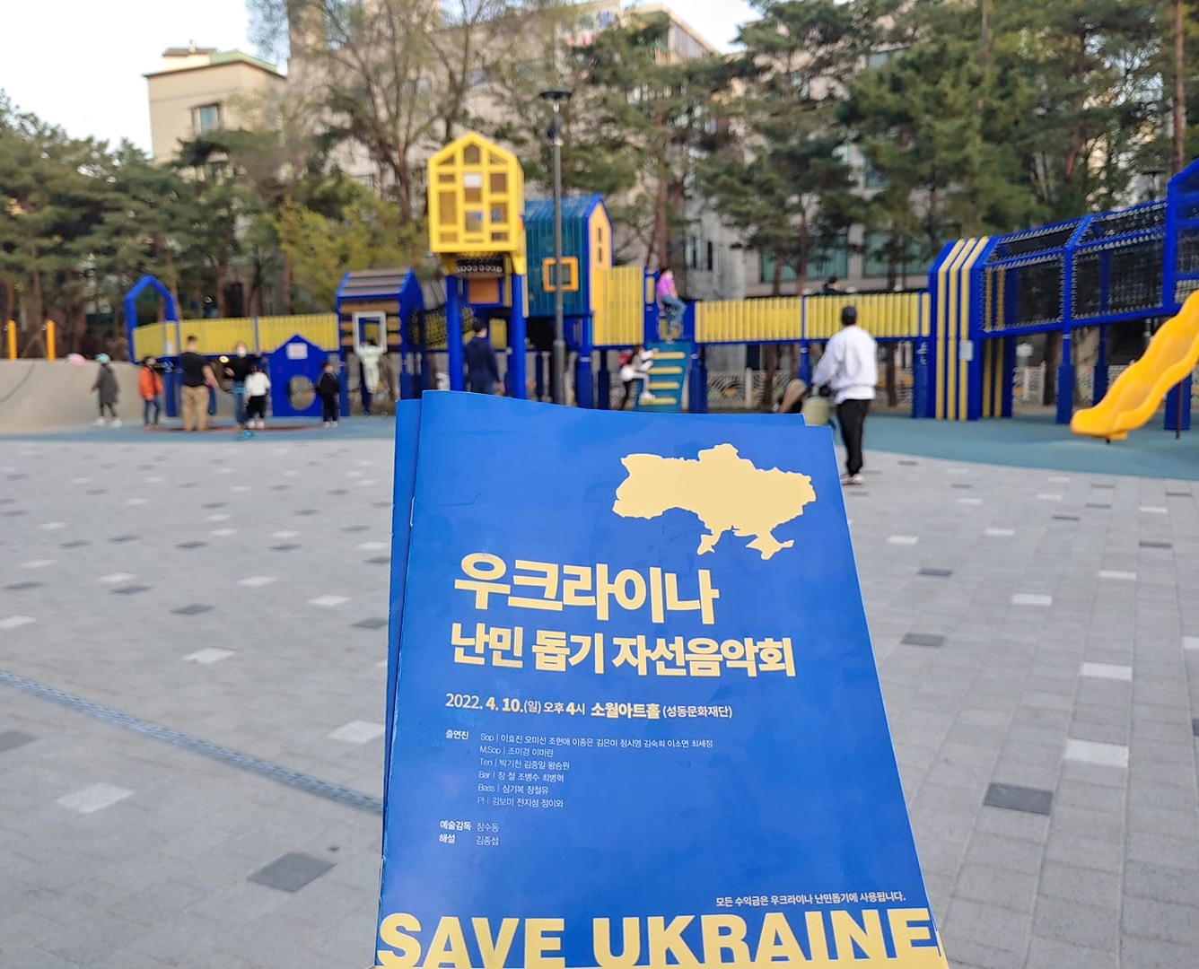 [플레이뉴스 박순영기자] 두 시간 여의 음악회가 다 끝나고 나와보니, 소월아트홀 앞 놀이터 미끄럼틀이며 그네가 파란색 노란색으로 우크라이나 국기 색이었던 것은 결코 우연만은 아니었을 것이다. 성동구청, 성동구립도서관, 소월아트홀이 모여있던 곳에서 지구 반대편 난민에게 보내는 노래 메시지는 그렇게 울려퍼졌다.