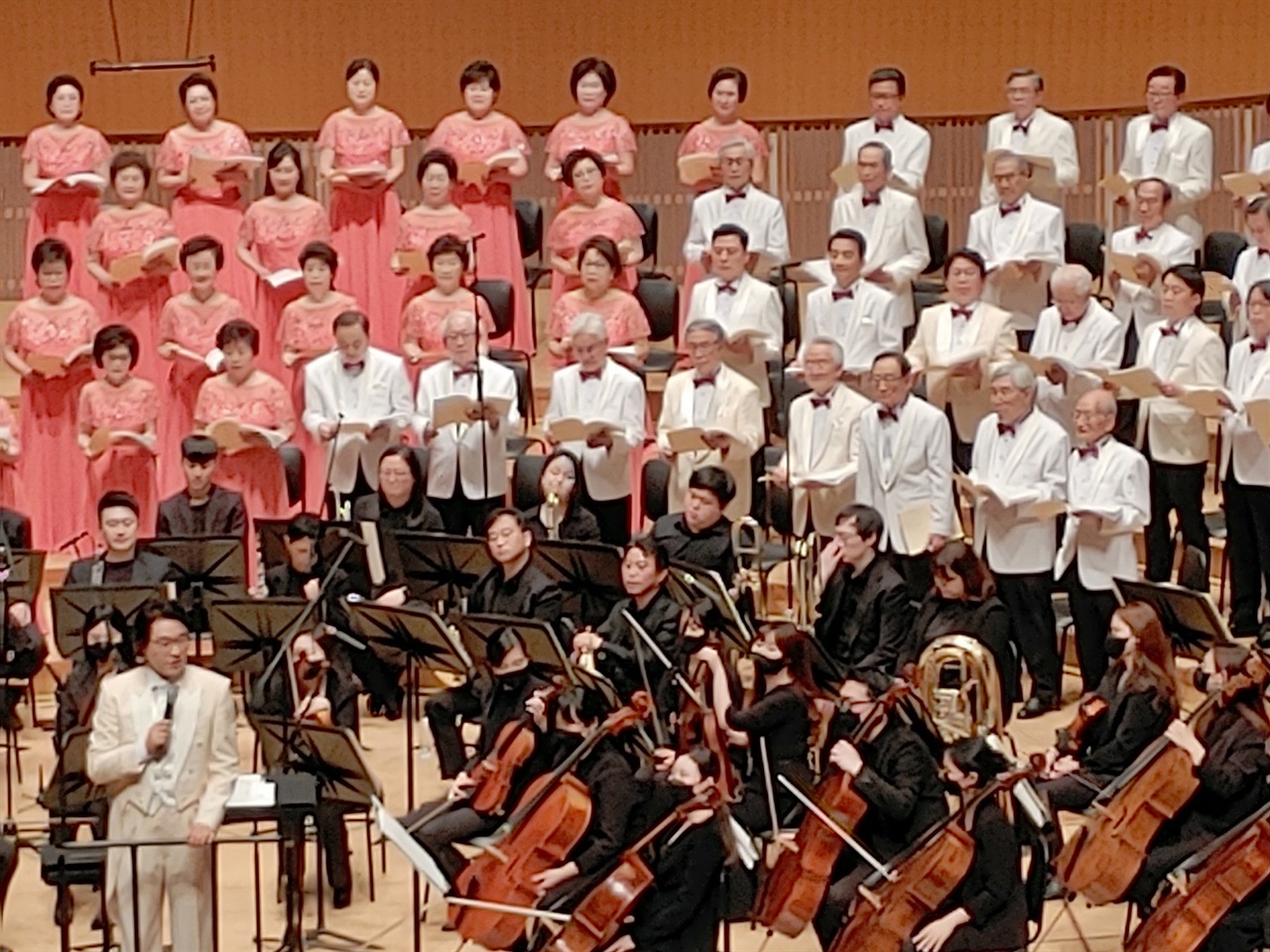 이어 백세합창단의 탁인성 단장(베이스)이 "많은 실버합창단에서 65세가 넘으면 뽑지를 않는다. 이건 아니라고 생각했다"라고 창단계기를 말하는데, 정말 공감이 갔다. "60세부터 96세까지 90명이 넘는 백세 꿈나무들이(!!이 대목에서 관객이 흐뭇한 박수를 또 보냈다) 매주 코로나와 싸워내며 이 무대를 준비했다. 많이많이 사랑해주시고 성원해주시길 부탁드린다"고 말하자 관객들은 뜨거운 박수와 환호를 보냈다.