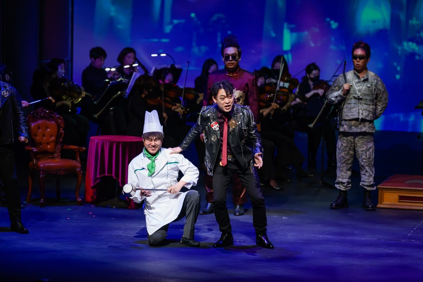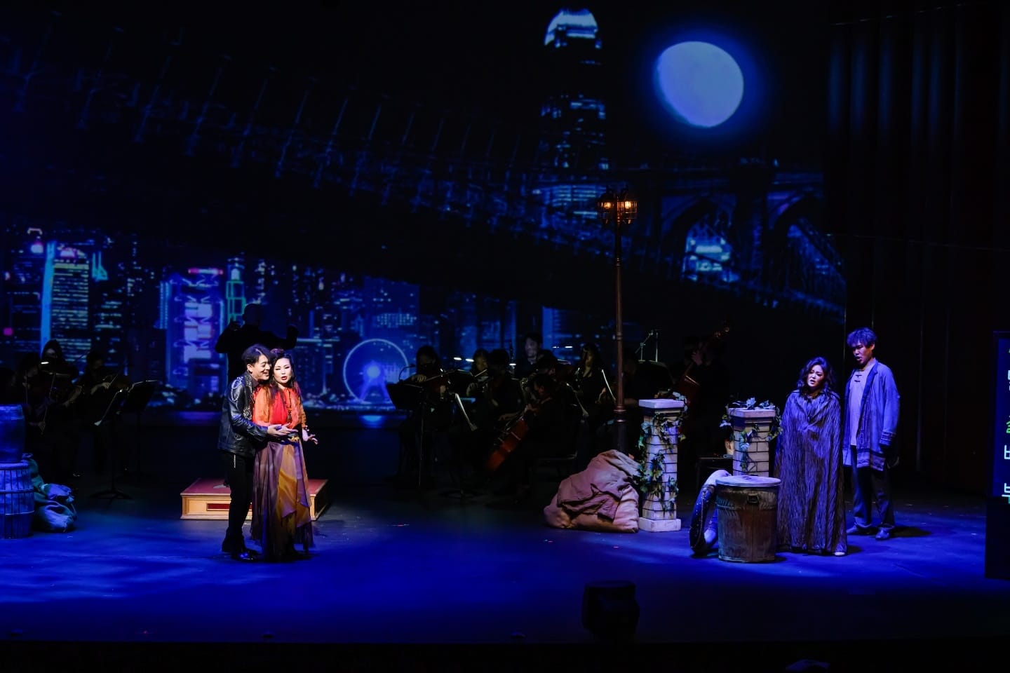 콘서트오페라지만 무대 위에 우나이 우레초 지휘의 앙상블스테이지오케스트라가 탄탄하고 유려한 반주를 해주면서 의자, 탁자, 가로등 등 약간의 오브제로 기능성을 살렸다. 영상으로 항구도시 밤의 어둑함과 운치를 각인시켰으며, 의상과 분장도 두카 역(테너 김중일, 왕승원)을 예로 들면 히피나 폭주족 스타일의 가죽재킷과 체인벨트, 레게머리로 시대에 대한 반항기를 뿜어내도록 하였다. 노이오페라코러스도 합창과 의상스타일로 암흑가 인물들을 멋지게 노래와 연기해주었다.