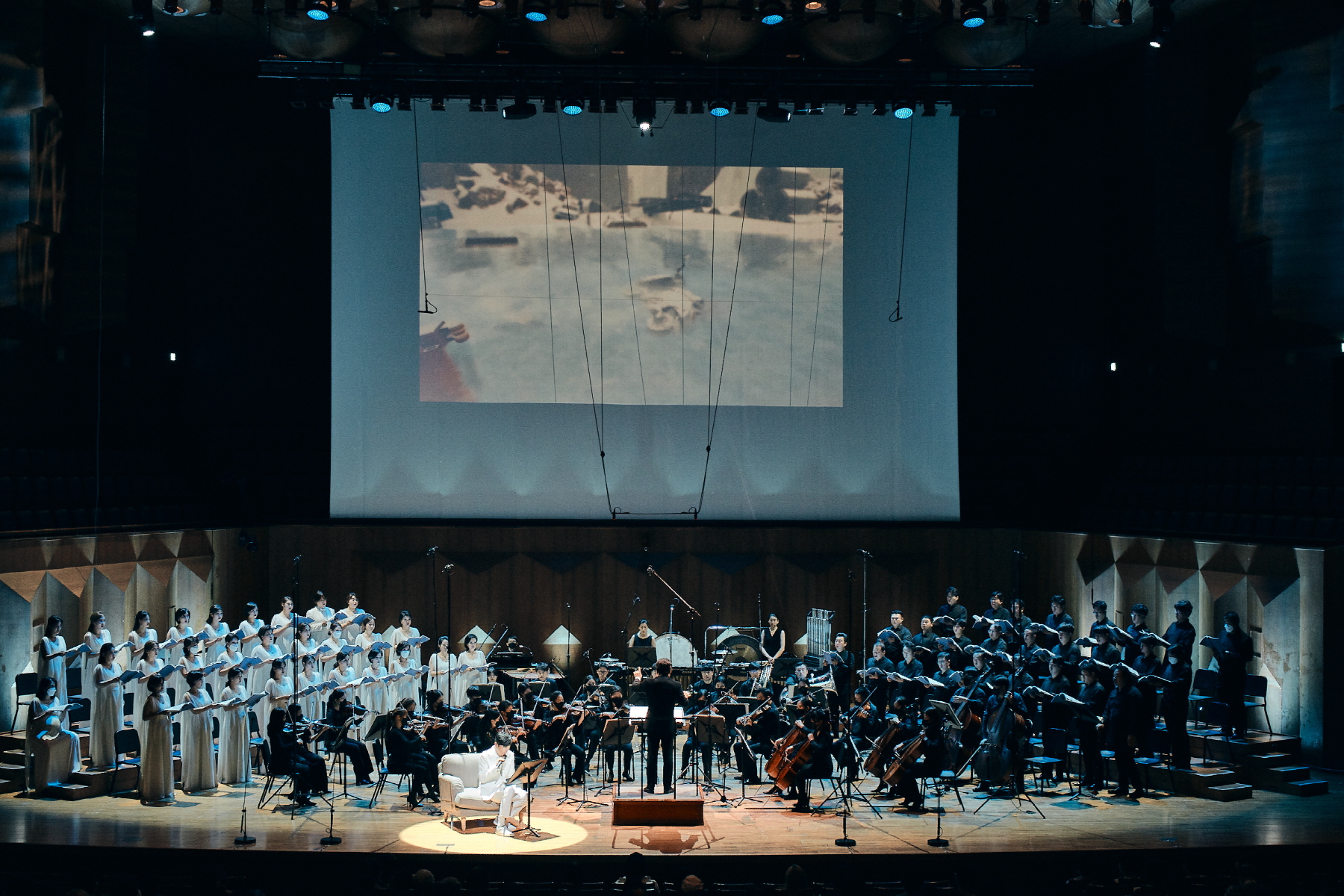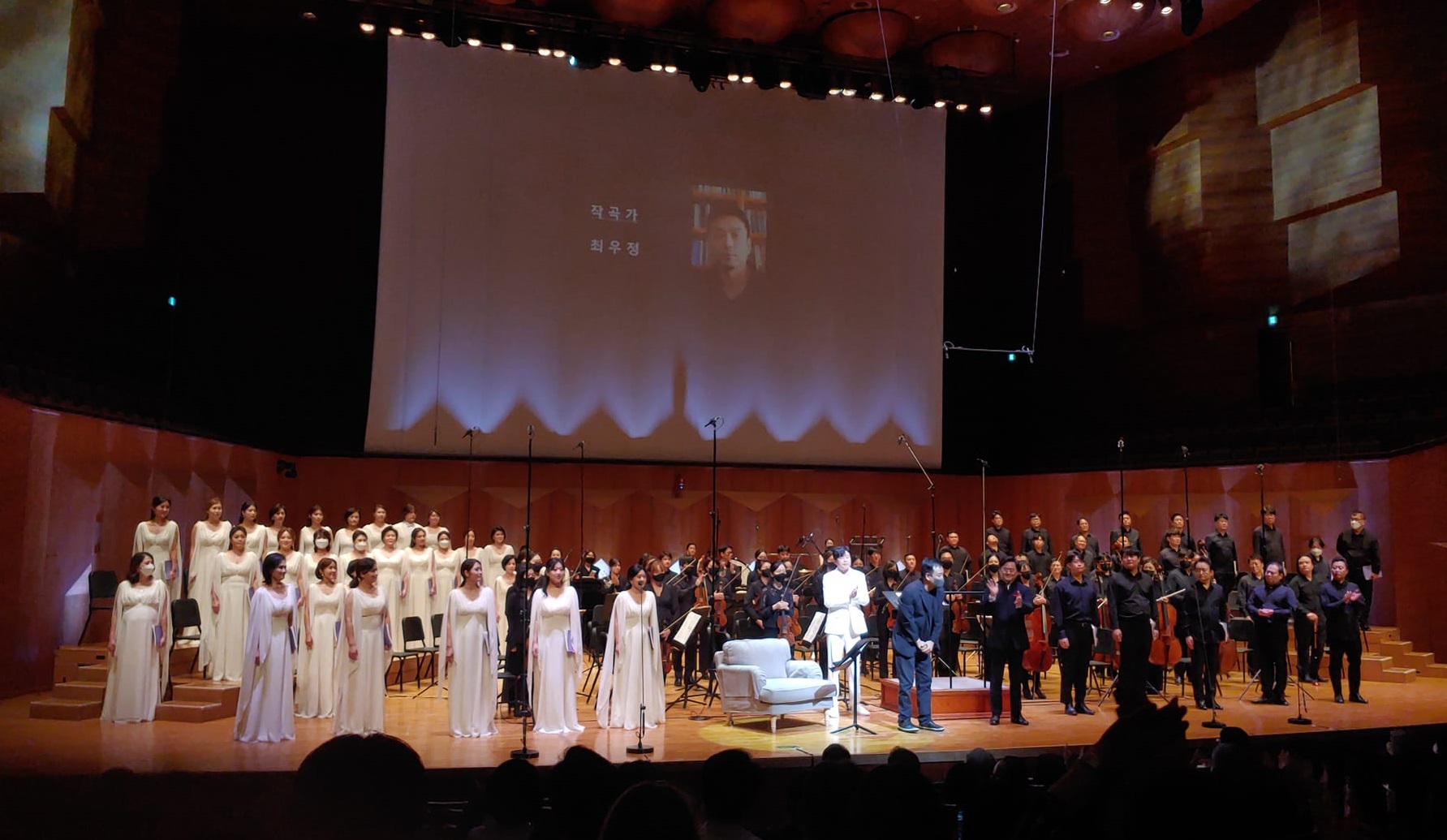 최승호 시인의 산문시를 통째로 가지고 와서 합창과 내레이터로 분리했다. 즉 말과 음악이 혼합하였는데 이렇게 나눈 건 원작자인 시인인가? 아님 작곡가인가? 이런 분리가 가사와 메시지 전달 차원에서는 효과적이었을지 모르겠으나 합창 본래의 음악적 유려함과 선율미는 반감시켰다. 프로코피예프의 '피터와 늑대', 스트라빈스키의 '병사의 이야기' 같은 음악극인데 편성만 합창이요 오케스트라다. 만약에 오르프의 '카르미나 부라나' 같은 방식이었으면 어땠을까? 연극적인 요소가 훨씬 빠졌을 테다.