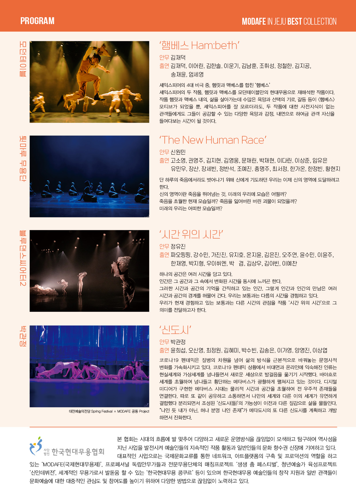 ‘MODAFE in JEJU Best Collection’은 ▲모던테이블 김재덕 ‘햄베스 Ham:beth’ ▲툇마루 무용단 신원민 ‘The New Human Race’ ▲블루댄스씨어터2 정유진 ‘시간 위의 시간’ ▲대전예술의전당 Spring Festival×MODAFE 공동제작 프로젝트인 박관정의 ‘신도시’ 총 4팀의 작품을 선보인다.