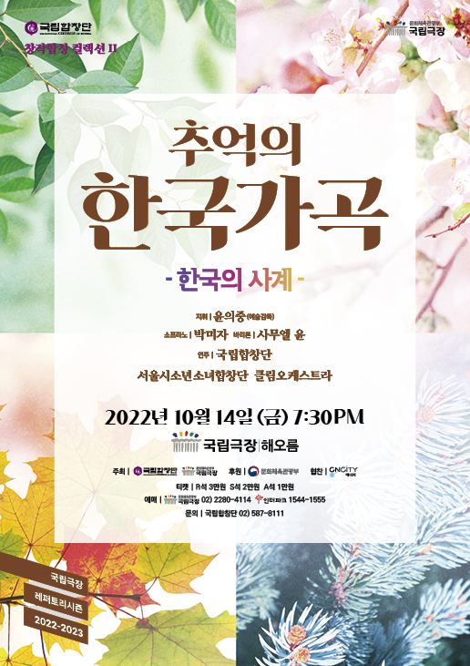 국립극장 레파토리 시즌으로 기획된 <한국의 사계-추억의 한국가곡>은 국립합창단 전임작곡가 안효영 한아름의 작편곡과 역대 전임작곡가인 조혜영, 우효원, 오병희 그리고 조성원, 나실인, 이지수의 다채로운 편곡으로 아름다운 한국의 사계를 그리고 있었다.