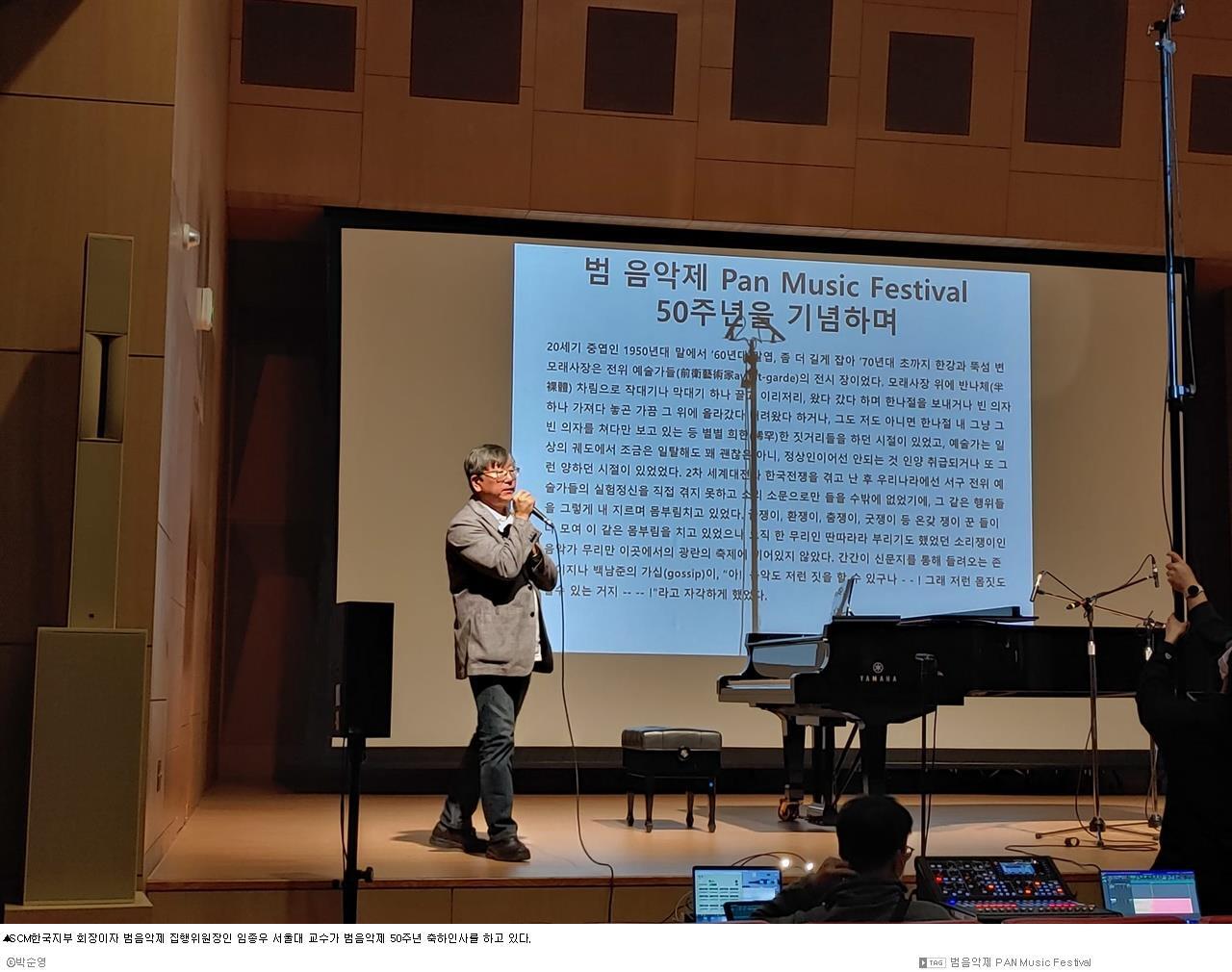 인사소개에 앞서 역대 50회의 PAN music festival의 포스터 모두를 영상으로 감상하니 반세기 50년이 숫자로만이 아닌 진정한 역사로 잔잔히 느껴졌다. 또한 이만방 교수가 준비한 원고를 읽으며 "1960년대 말부터 한강변 광나루 모래사장에서 각종 전위예술인들이 모여 마음껏 저마다 표현하는데, 오직 음악만이 끼지 못했고, 간간히 서방의 존케이지, 백남준의 행보가 들려왔다"며 범음악제가 태동의 계기와 연혁을 들려주었다.