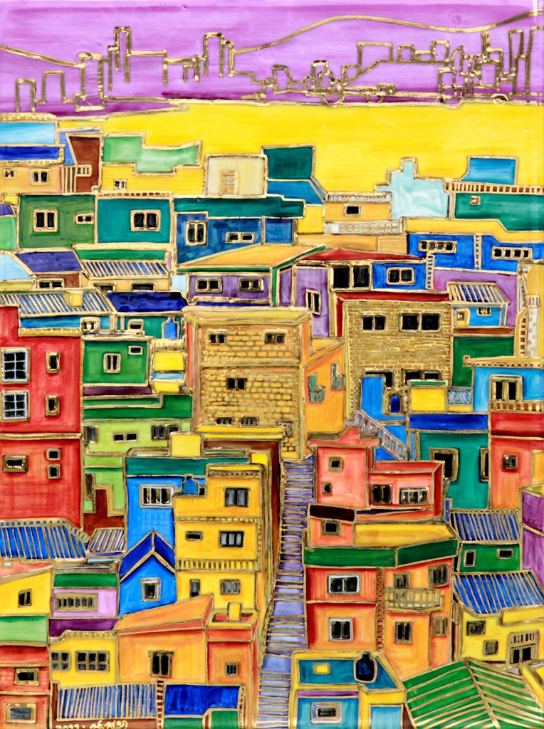 하늘 바탕이 주도하는 색에 따라 느껴지는 도시의 이미지는 확연하게 달라 다양한 우리들의 삶을 만나볼 수 있고 오밀조밀 몰려있는 도시의 주택 풍경은 현대 도시의 일반적 모습을 재현 하였다.