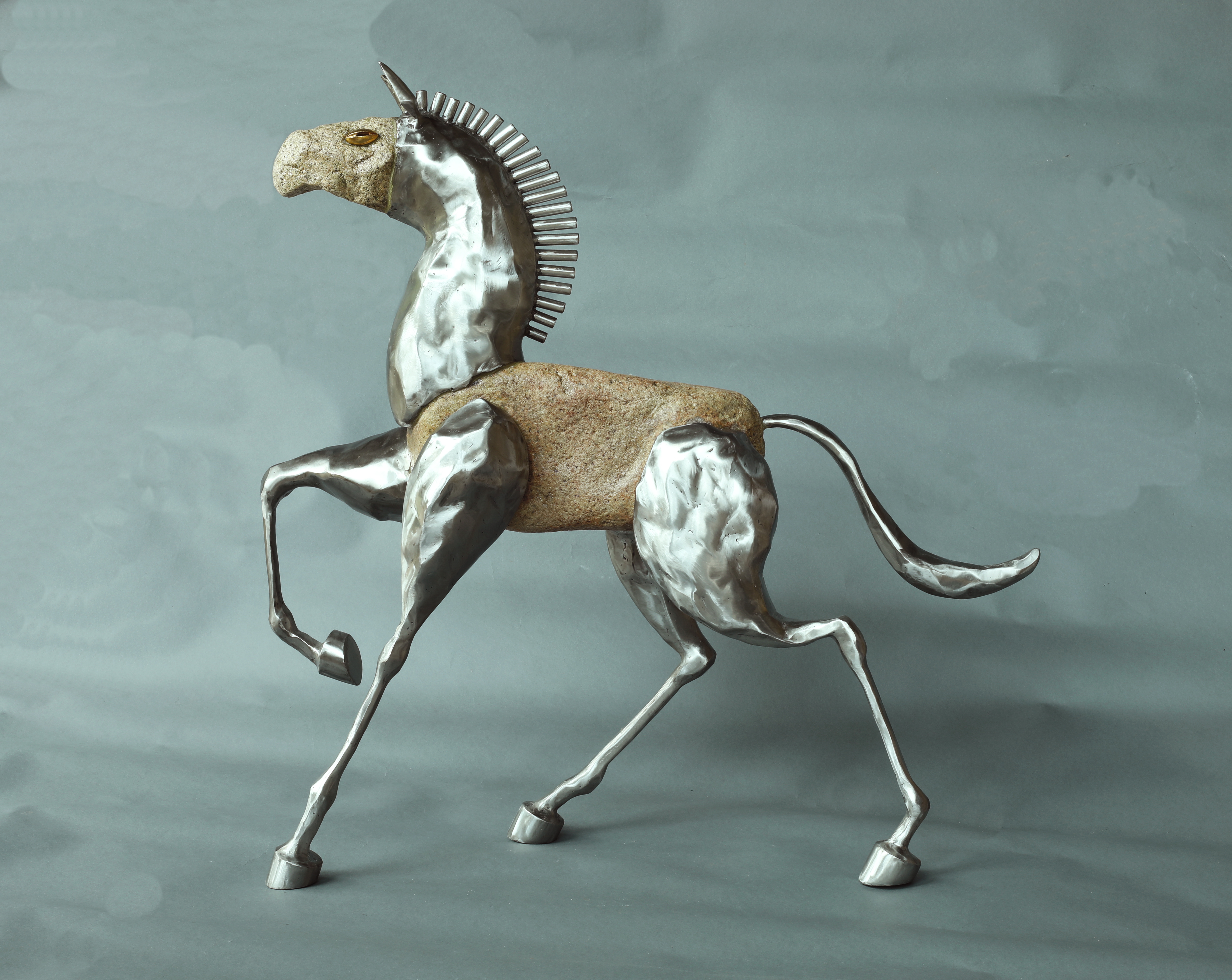 또한 한 작품에 석재, 철재, 스테인리스 등 다양한 재료를 결합하여 독특한 풍격을 자아내는 작품을 제작해왔다. 현대를 상징하는 오브제는 스테인리스로, 원시를 상징하는 오브제는 석재로 두어 이를 통해 원시와 현재를 연결한다.
