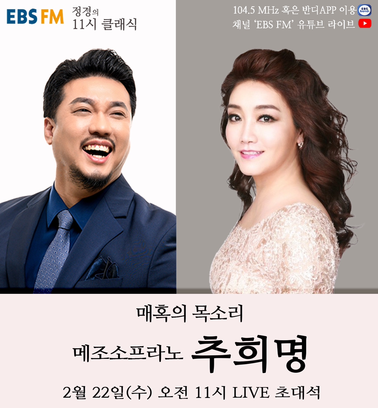 매주 수요일 코너인 '수요초대석'에서는 클래식 음악계의 명사들을 초대한다. 22일, 수요일에는 드라마틱한 감성으로 감각적인 무대를 선사하는 매력적인 메조 소프라노 추희명이 출연하고 라이브 연주와 함께 음악과 인생 이야기를 들려줄 예정이다.