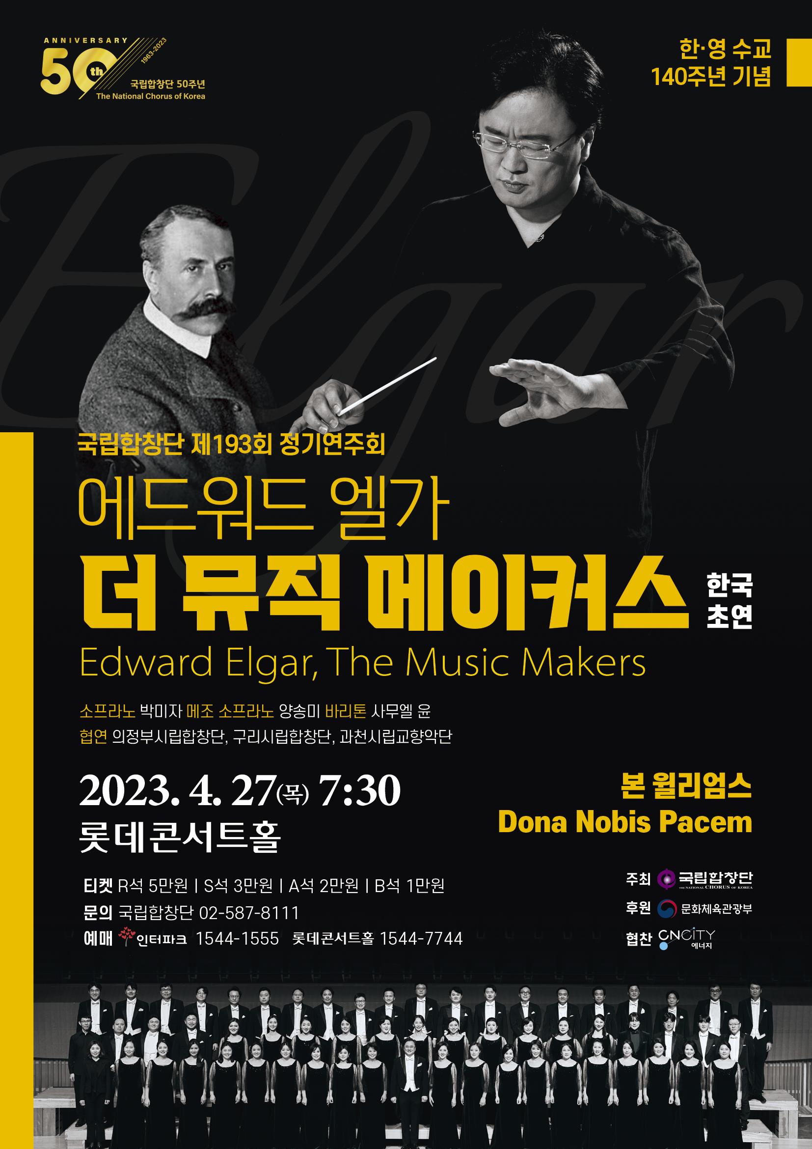 이어서 오는 427() 오후 730분 롯데콘서트홀에서 국립합창단 제193회 정기연주회 에드워드 엘가 '더 뮤직 메이커스'를 개최한다. 이번 정기연주회에서 는 한영 수교 140주년을 기념하여 두 명의 영국 작곡가들을 소개한다. 첫 시작은, 영국 음악의 부흥을 이끈 세계적인 낭만주의 작곡가 에드워드 엘가(Edward William Elgar, 1857~1934)의 '더 뮤직 메이커스(The Music Makers)'를 한국 초연 작으로 선보이며, 20세기 전반에 걸쳐 가장 영향력 있는 음악가로 꼽히는 레이프 본 윌리엄스(Ralph Vaughan Williams, 1872~1958)'도나 노비스 파쳄(Dona Nobis Pacem)'을 차례로 연주한다.