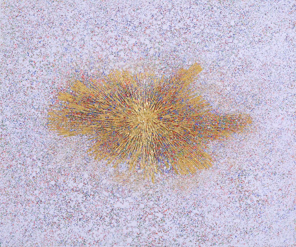 흩뿌리고, 긁어내고, 바르고, 붙이는 혼합 작업과정의 결과물이 희망의 빛 시리즈 작품으로 완성 되었다. 반짝거리는 노란 금빛은 강열하여 감동의 빛으로 승화되고, 사방으로 불규칙하게 뻗는 빛은 자유로운 사고와 행동을 의미한다. 과도할 수 있는 밝음은 일정한 원형의 크기로 잔잔하게 만들어 겸손과 배려의 온화한 심성을 찾을 수 있도록 했다.