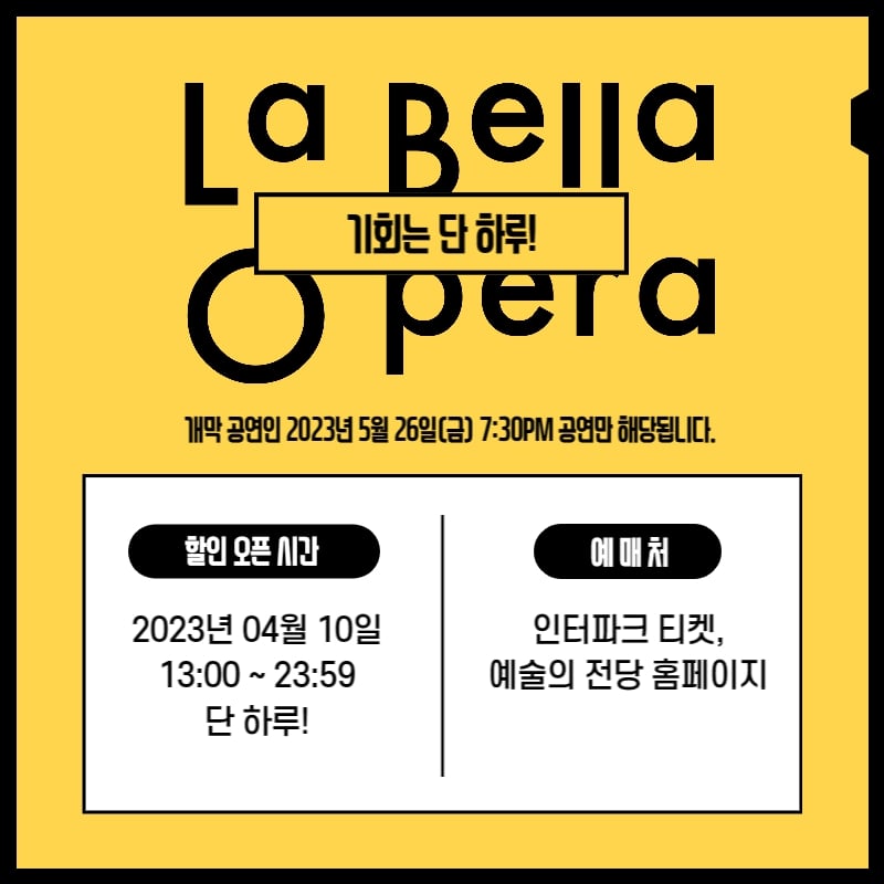 이강호 예술총감독은 성공적 공연을 위해 준비하고 있는 굿 아이디어도 살짝 공개했다. 그는 “5월 26일 공연에 한해 1만8000원에 볼 수 있는 ‘4·10 타임세일’을 진행할 예정이다”라며 “모든 좌석의 구분 없이 단 하루 무려 92% 정도의 할인을 하는 셈이다”라고 말했다. 그러면서 “누군가 ‘단장님이 미쳤다’라고 말했는데 기분이 좋았다”라며 “광클릭 오페라를 향한 첫 발자국을 힘차게 내딛겠다”고 말했다.
