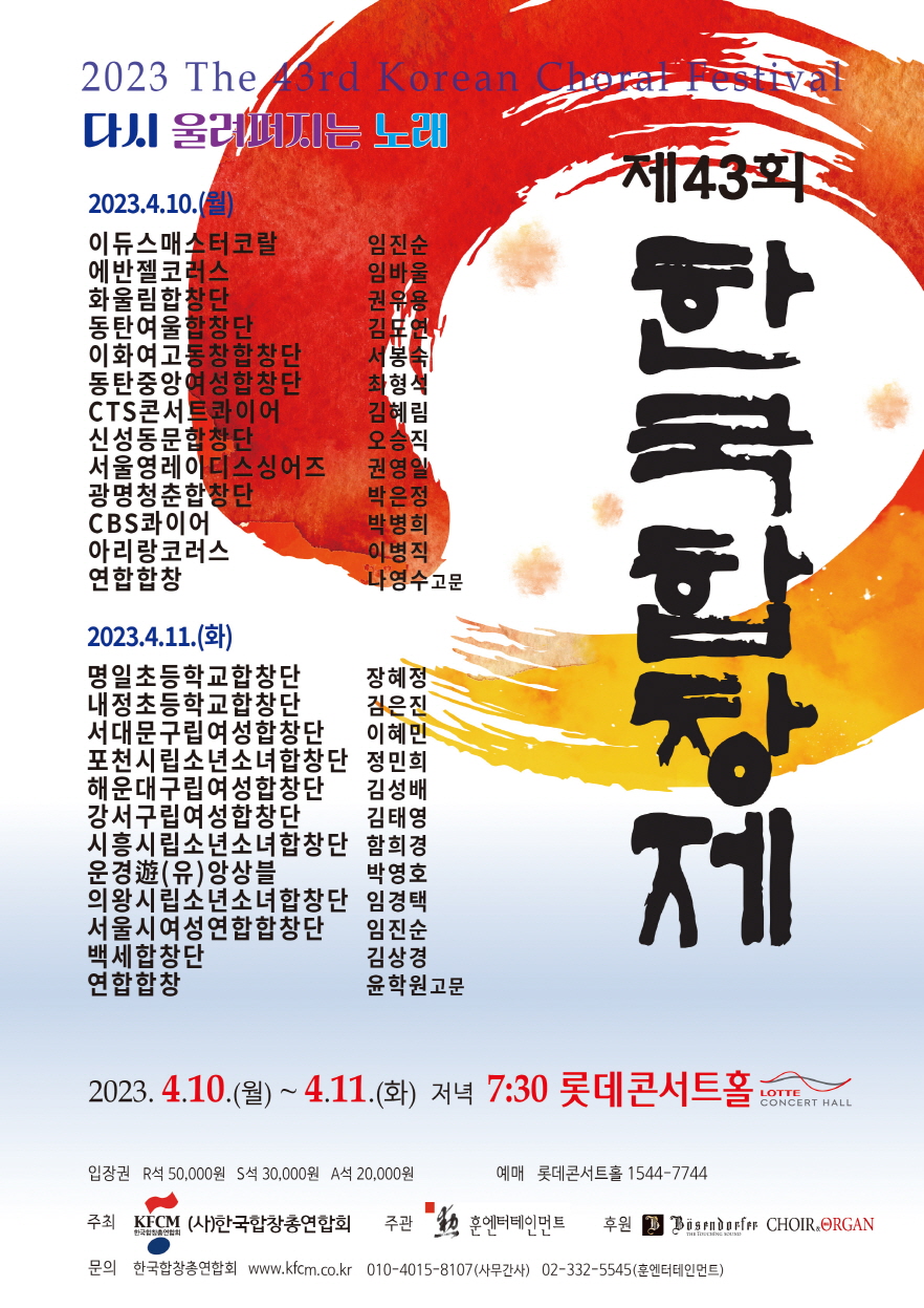제43회 한국합창제는 4월 10, 11일 롯데콘서트홀에서 개최되며 한국합창총연합회 주최와 훈엔터테인먼트 주관으로 화려한 축제를 준비하고 있다.
