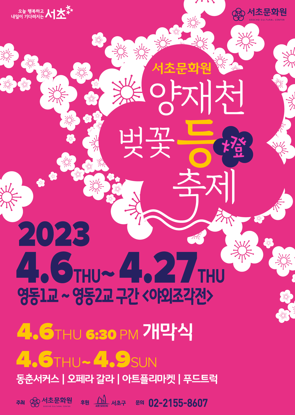 코로나19여파로 지난 4년간 취소 또는 축소 개최된 ‘양재천 벚꽃 등(燈) 축제’가 올해 전면 대면 행사로 진행된다. 금번 제5회를 맞이한 ‘양재천 벚꽃 등(燈) 축제’는 약 3만여 명의 국내외 상춘객이 찾아오며 서울 3대 벚꽃축제로 자리매김했다.