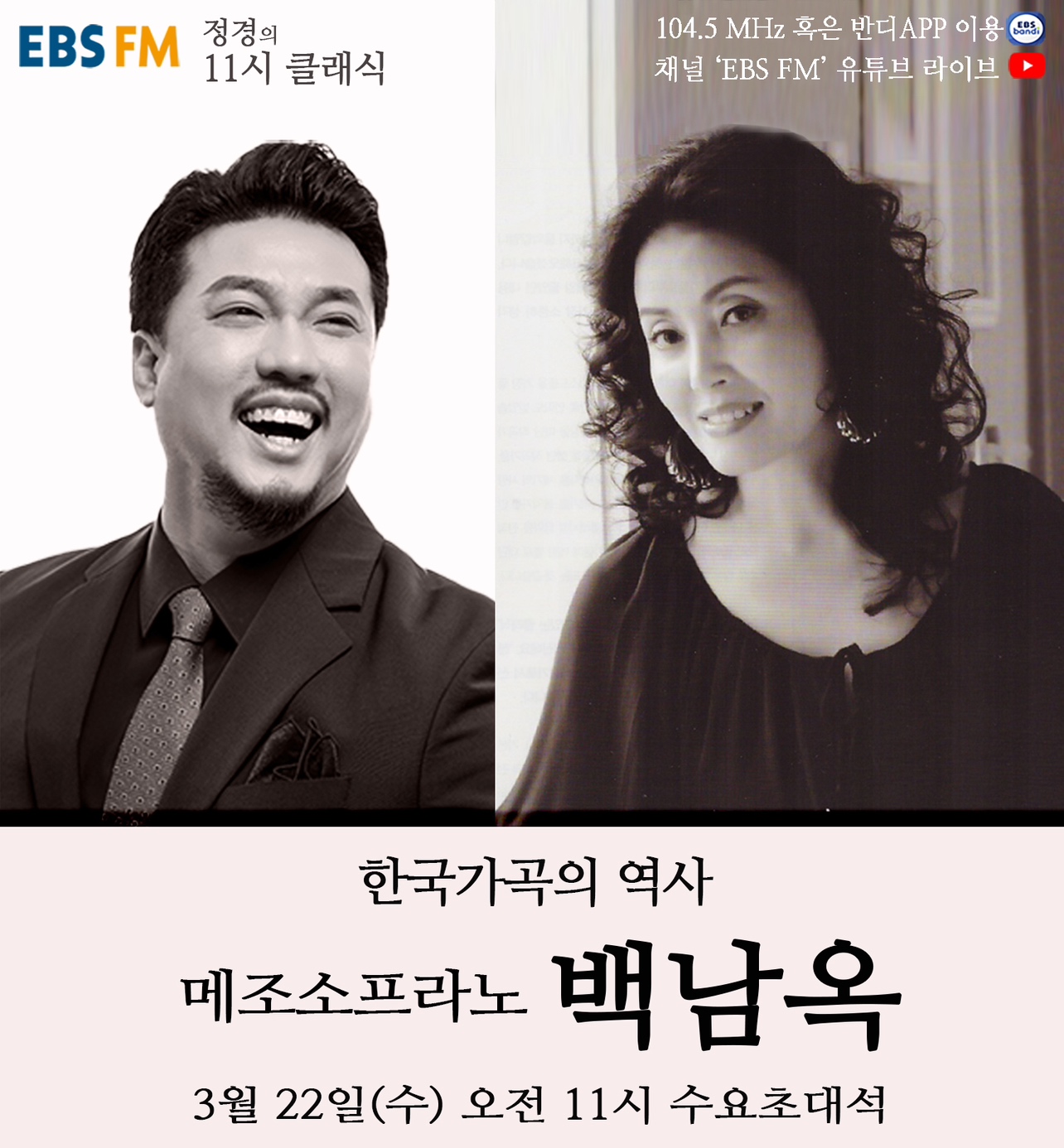 매주 수요일 코너인 '수요초대석'에서는 클래식 음악계의 명사들을 초대한다. 3월 22일에는 우리나라를 대표하는 프리마돈나이자 한국가곡의 여왕, 메조소프라노 백남옥이 출연해 음악과 인생 이야기를 들려줄 예정이다.