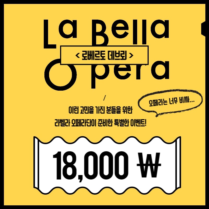 이처럼 라벨라오페라단의 파격적인 빅 이벤트는 5월 26일(금) 부터 28일(일)까지 예술의전당 오페라극장에서 개최되는 한국 초연 도니제티 오페라 ‘로베르토 데브뢰’의 개막공연인 5월 26일(금) 오후 7시 공연에 한하여 ‘전석 18,000원’ 이라는 가격에 진행된다.