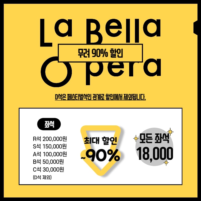한국 오페라 75년 역사 최초, 예술의전당 전석 18,000원… 최대 91% 할인! 단장님이 미쳤어요!티켓 값의 센세이션! 치킨 한마리 보다 저렴한 오페라?오페라는 비싸다? 대한민국 No.1 오페라단에서 N..