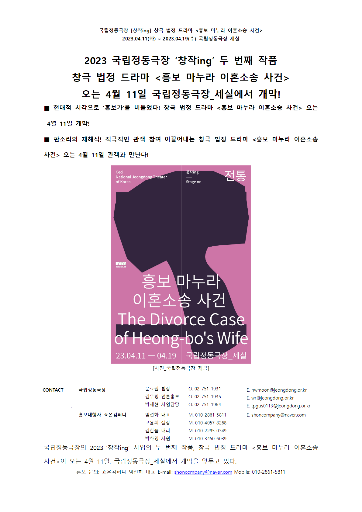 2023 국립정동극장의 ‘창작ing’ 사업의 선정작 창극 법정 드라마 '흥보 마누라 이혼소송 사건'은 인터파크 티켓과 국립정동극장 홈페이지에서 예매가 가능하며, 4월 11일 국립정동극장 세실에서의 개막을 앞두고 있다.