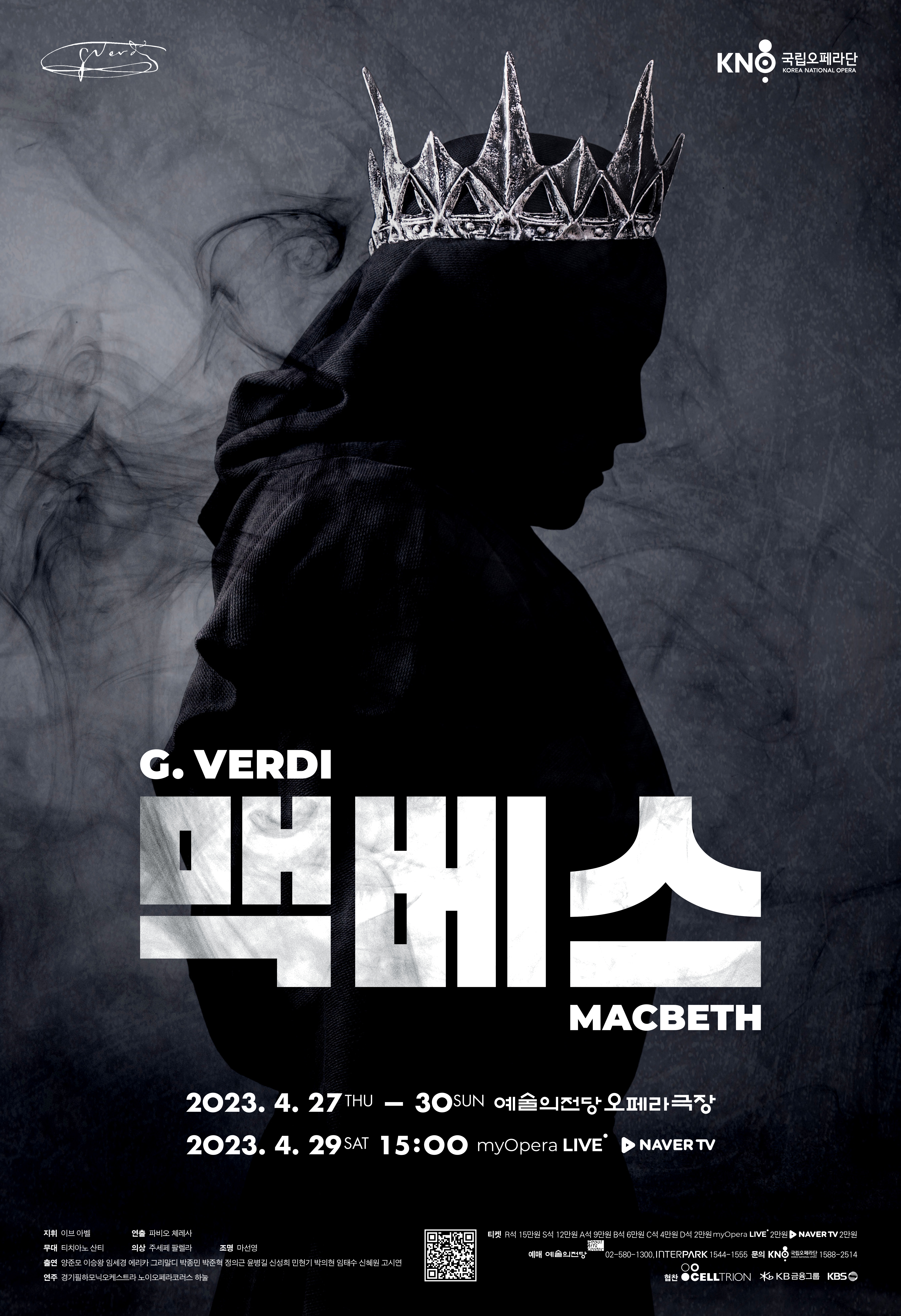 | 티켓 | R석 15만원, S석 12만원, A석 9만원, B석 6만원, C석 4만원, D석 2만원 크노마이오페라 & 네이버 TV 2만원 |